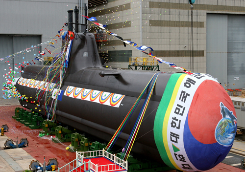The new 214-class submarine, named the Ahn Jung-geun after the late independence fighter against Japan’s colonial rule of Korea in the early 20th century, was officially launched yesterday in a ceremony at the Hyundai Heavy Industries dockyard in Ulsan. The 1,800-ton submarine will be commissioned and deployed late next year, along with two other 214-class submarines that were launched in 2006 and 2007, Navy officials said.
