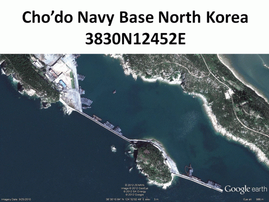NK Leadership Watch has many more photos and breaks it down a bit more. KPA Navy Unit 123 is located on Cho’do (Cho Islet or Island). A quick check of GoogleEarth reveals several NorK naval platforms located here.