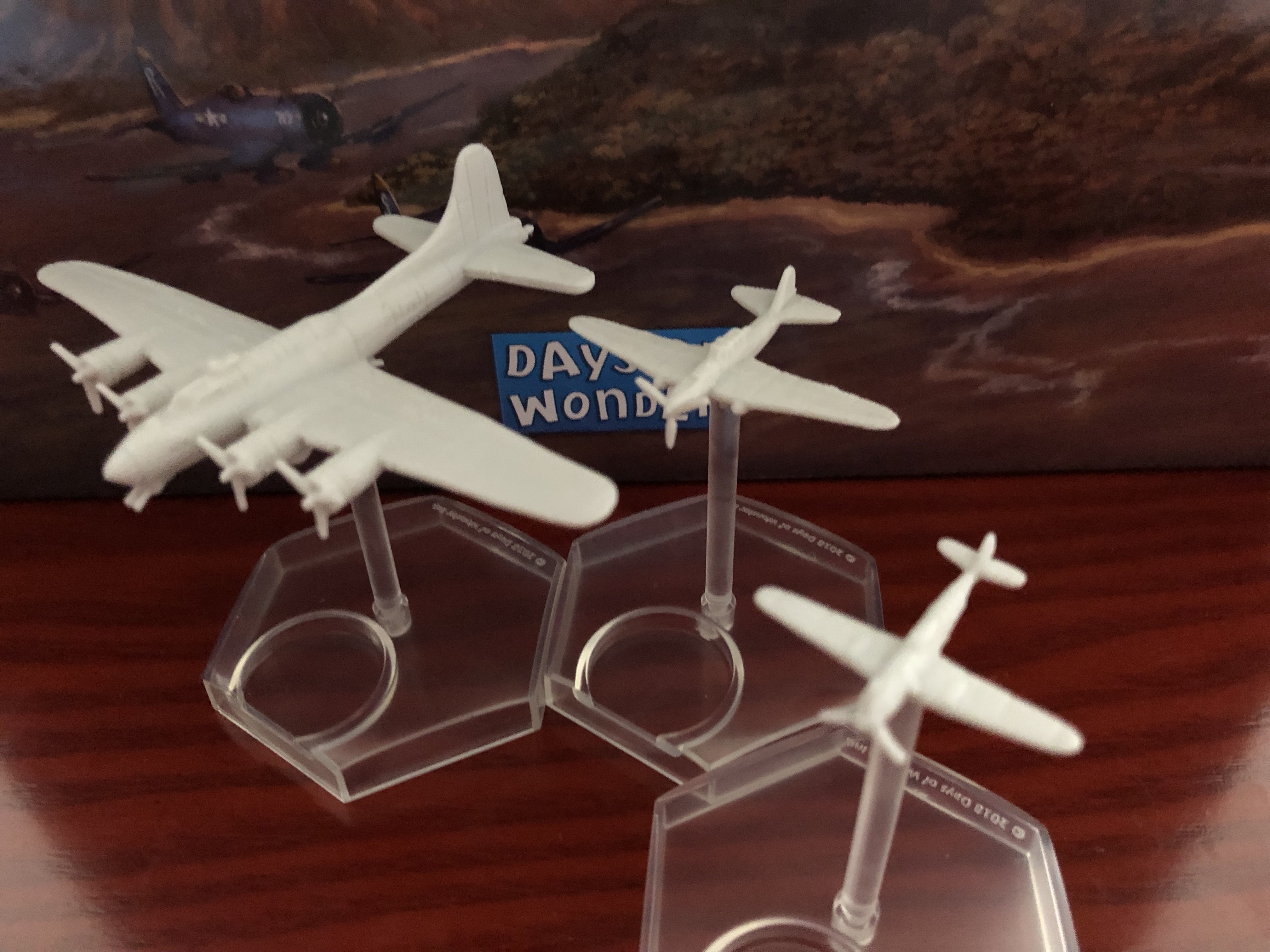 The first abstraction that jarred me is the model colors – or lack thereof. Although I looked at the ad copy several times, when I first opened the box I was confused by all the aircraft being the same molded color. I had not seen this in a DoW game since Battlelore 1st Edition. Granted, production cost is probably driving DoW to this decision; nonetheless it was jarring seeing all the aircraft in the same, neutral, off white. The model details are acceptable but even the aircraft recognition nerd in me has some issues immediately recognizing which plane is which on the battlefield. The aircraft stands have a place for a Nation Marker but honestly, the lack of color variation was unexpected and diminishes the play experience.
