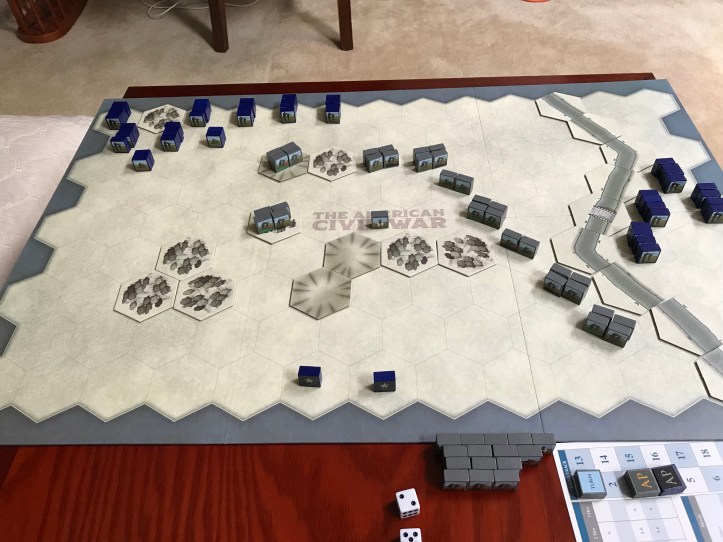 Tactile Components: Middle RMN Boy loves the blocks in HtL: ACW. Not only are the blocks easy to distinguish, he can arrange, and rearrange, the blocks in many different ways. Sometimes he puts all the infantry in a column; other times he arranges them in a 2×2 formation. Sometimes he faces them towards a hexside in a manner that makes his opponent feel surrounded like they are turning a flank. But it’s not just the blocks on the map, the blocks used to track the Action Points (AP) on the Player Aid Card also give him that tactile interaction with the game.