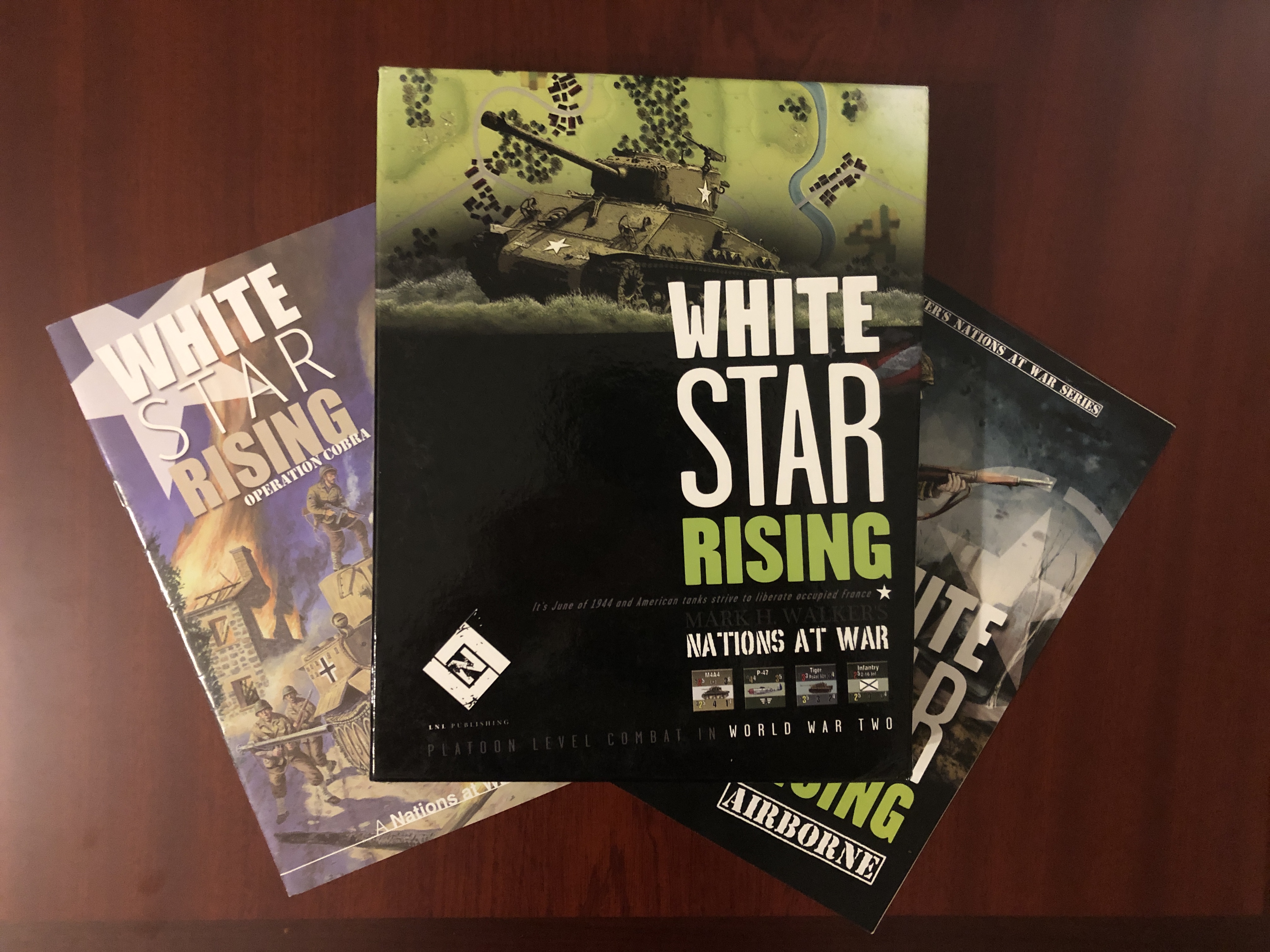 Nations at War: White Star Rising (Lock ‘n Load Publishing, 2010) – I don’t really need another World War II tactical game system; I’m very happy with my Conflict of Heroes series from Academy Games. Acquired through trade with no real big expectations. First impression is this platoon-level game is reminiscent of PanzerBlitz (Avalon Hill, 1970) but with chit-pull activation and command rules (both of which I really like). Maybe some interesting potential here, will have to see…. (Acquired at same time were two expansions: Nations at War: White Star Rising – Operation Cobra and Nations at War: White Star Rising – Airborne)