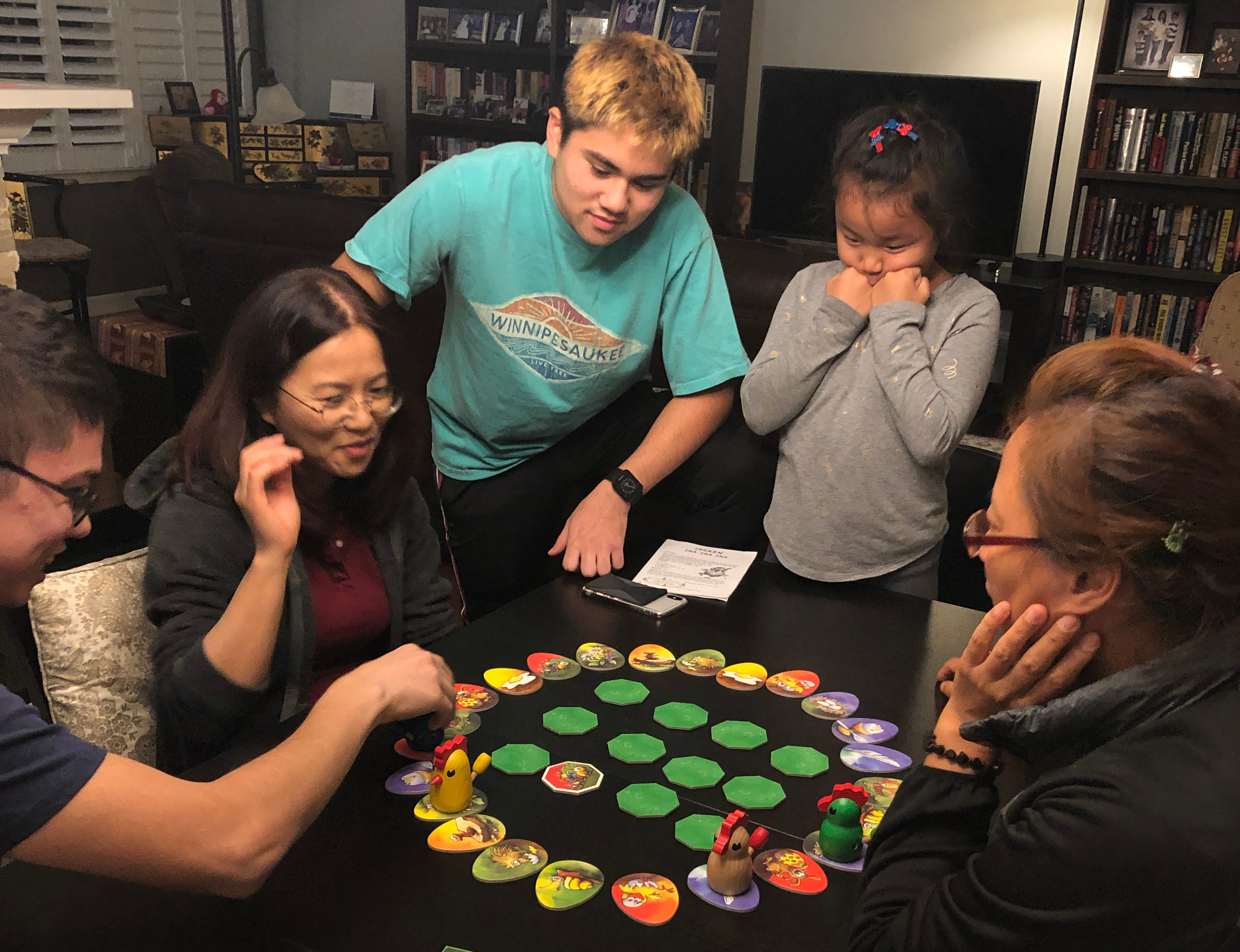 Some of earliest posts on this blog covered family boardgames, and one of the more popular in the RockyMountainNavy house back in the late ‘oughts was Chicken Cha Cha Cha (Rio Grande Games, 1997). I am happy to report that this game has stood the test of time (over 10 years of play) and is still a favorite in the RMN home. This week Mrs. RockyMountainNavy pulled it out to play with one of her students and mother. I was fortunate enough to be home at the time and was able to capture a few pictures.