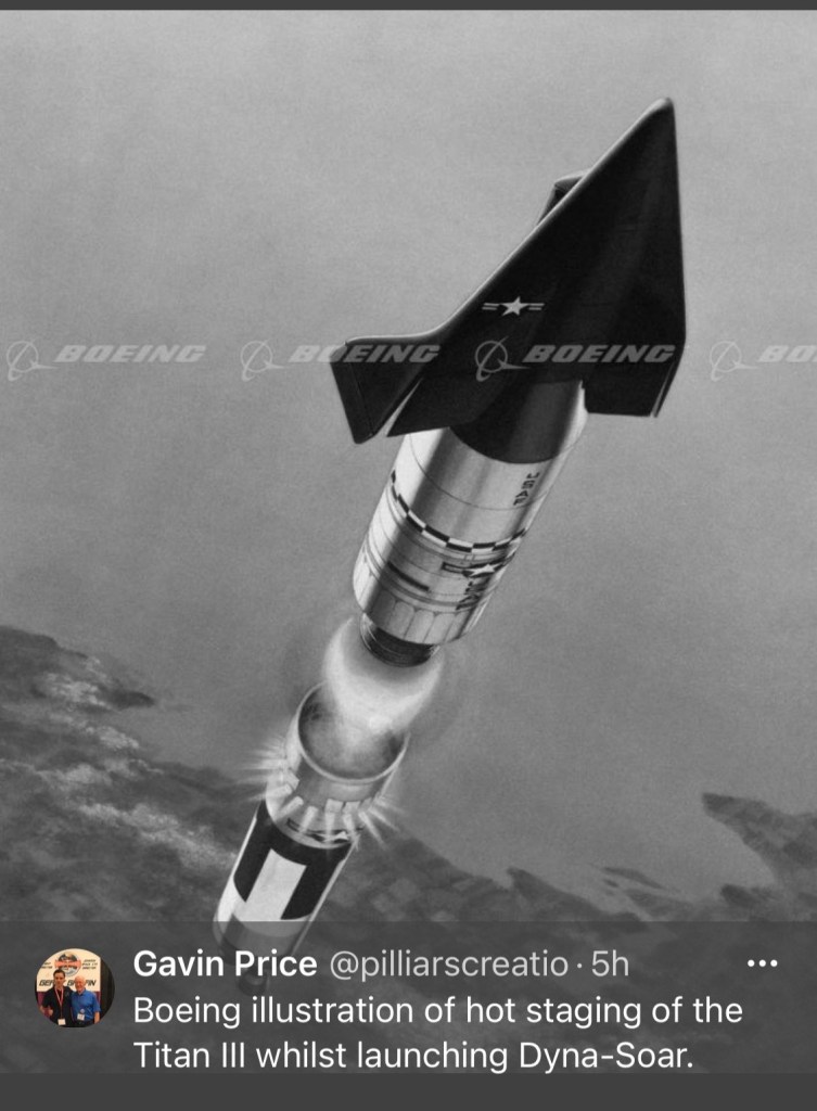 This mini Traveller RPG adventure was inspired by a tweet by @pilliarscreatio showing a Boeing Dyna-Soar hot-staging into orbit.