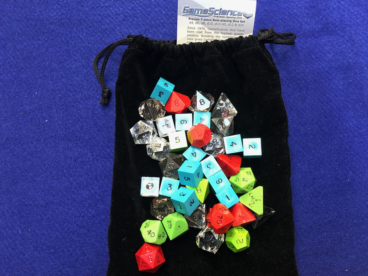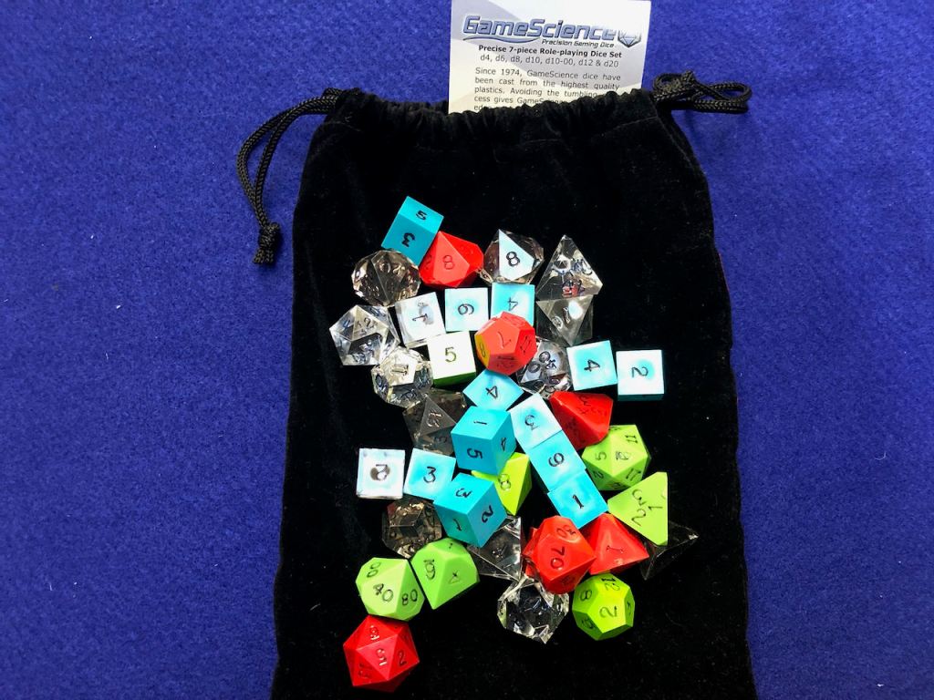 Dice bags – Alas, I don’t actually have a Crown Royale bag but I do use that smaller HP mouse bag for travel (Photo by RMN)