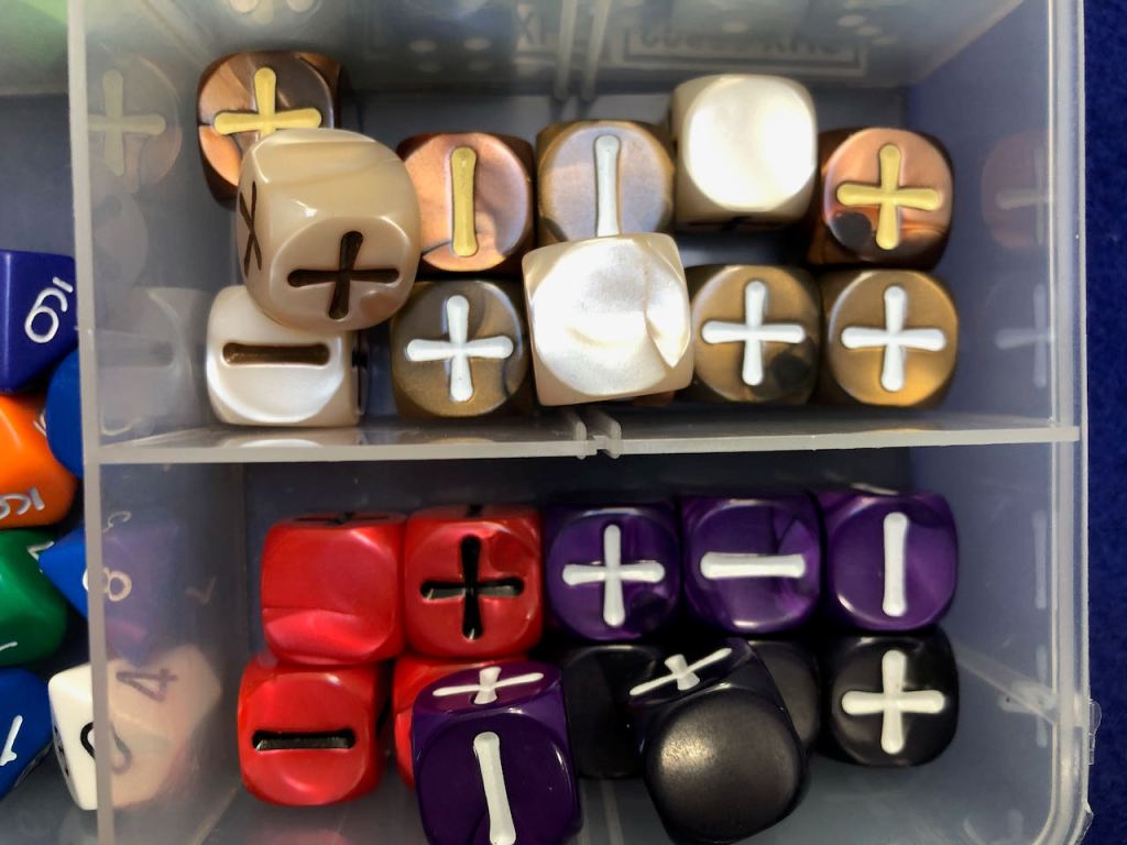 Evil Hat FATE Dice – look to be 16mm sized (Photo by RMN)