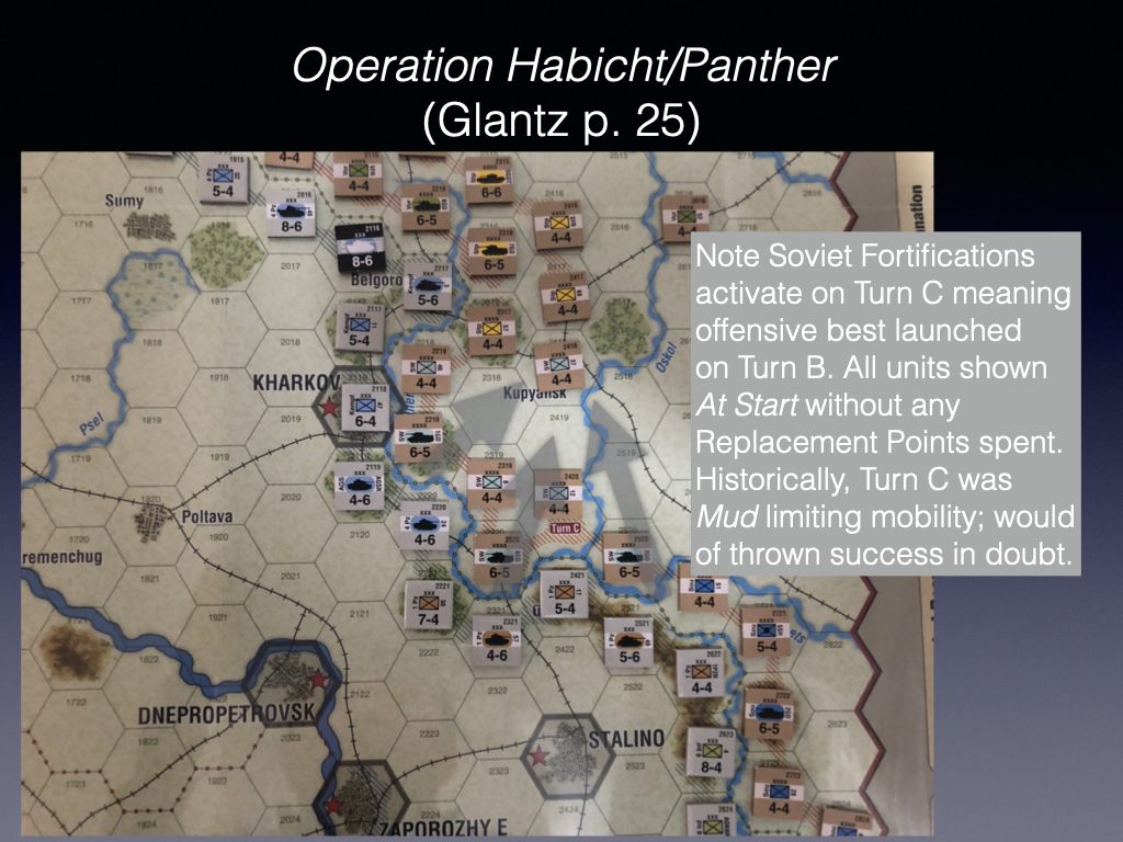 One part that caught my attention for a possible “what if” was the plans for Operations Habicht and Panther (Glantz, p. 25) which were intended as follow-on attacks from Citadel. But “what if” one reversed the plan? What if the Germans launched Habicht/Panther in May 1943 (Turn C) before the Soviet fortifications in that area are complete with orders to seize Kuyansk and cut the rail line from the south into the Kursk salient?