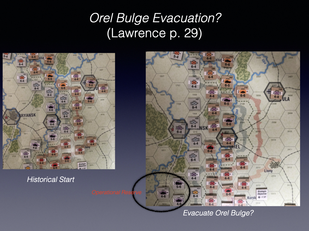 A possible “what if” scenario that jumped out at me from Lawrence’s preparations was an idea rejected at the June 27 pre-battle commander’s conference. At that meeting Hitler, “rejected a recent memo from Army Group Center to evacuate the Orel bulge so as to create an operational reserve. He also again rejected the idea of a “backhand” strike. He decided it would be better to seize the initiative and attack” (Lawrence, 29). This could be recreated in Battle for Kursk by having the Germans chose a “Reposition” or maybe a “Deploy” Posture on Turn D and evacuating the Orel bulge by realigning forces along the 1800 hex column. This would shorten the front lines in this area from 7 hexes to four hexes. More importantly, the four Infantry Corps and four Panzer Corps within the Orel bulge would take over the new line (4x Infantry Corps?) leaving four Panzer Corps to become that “operational reserve.” It might still be possible to launch Citadel on Turn 1 and not lose the initiative to the Soviets. [In Battle for Kursk if the Germans do not attack by Turn 1 they “lose the initiative” to the Soviets as the German bonus VP marker on Kursk turns Soviet and is placed in Kiev.]