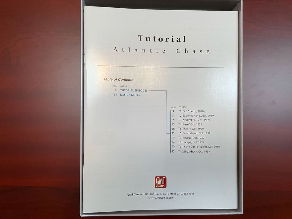 Although each broad section in Atlantic Chase is a logical follow-on to the previous one, the 64-page Rule Book actually just lays out the rules and doesn’t “teach” you how to play the game. For that you need the 56-page Tutorial book. The designer even tells us that the Tutorial book is where the learning is at for both “Newbie” or “Salty Grognard:”