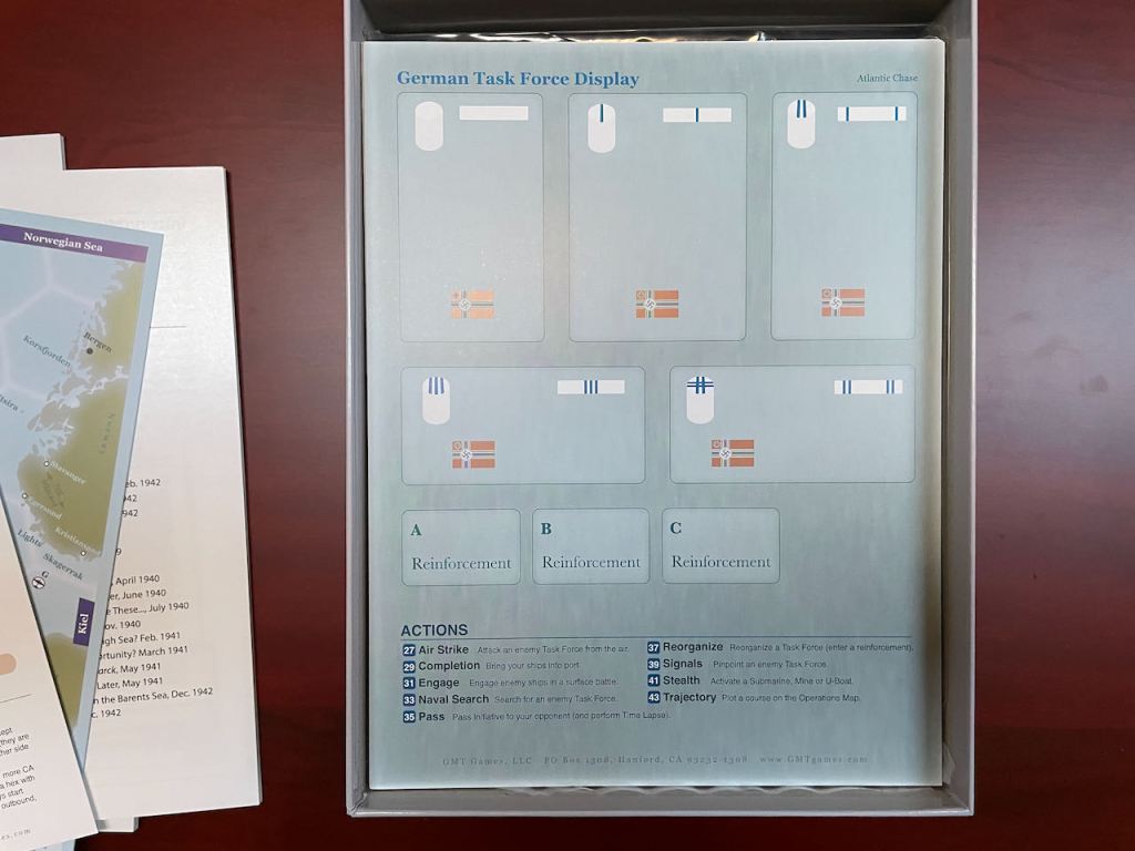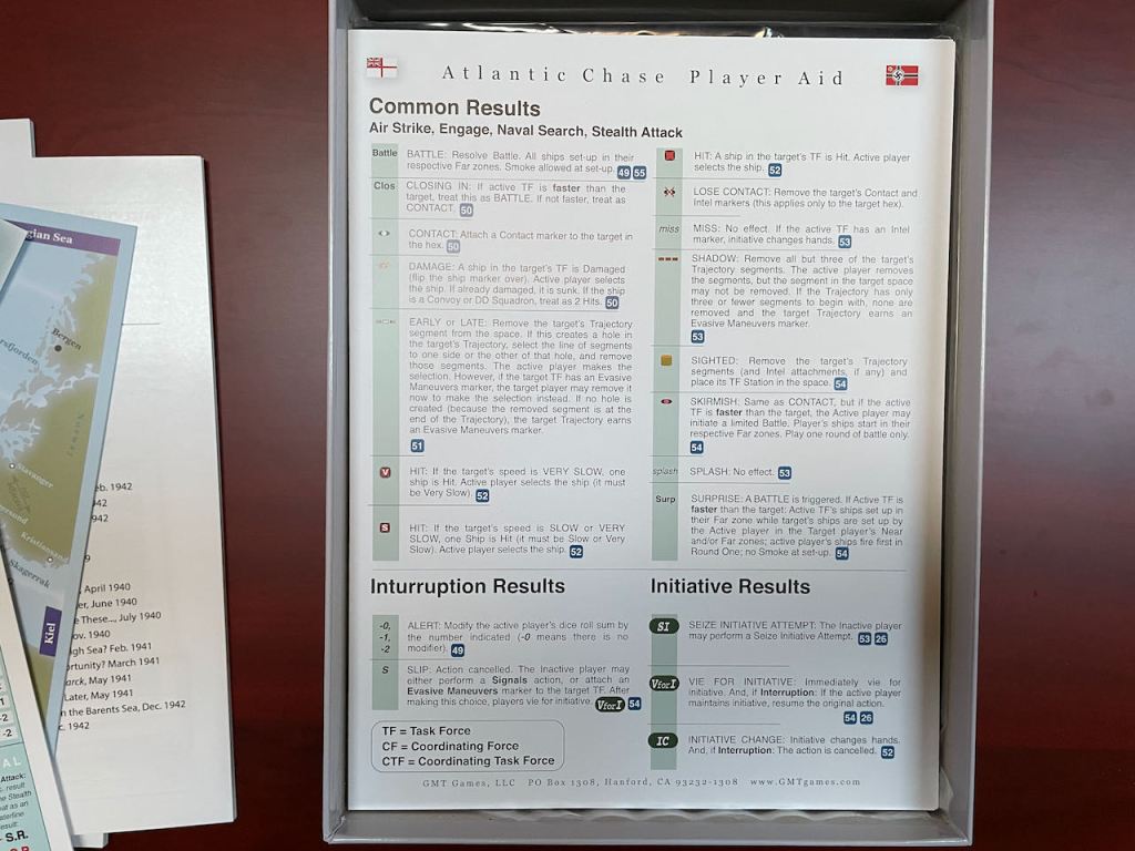 One also needs to be organized when playing Atlantic Chase. It’s not there are too many counters, but all those fiddly little matchstick Trajectory Markers need to be organized. Here I wish GMT Games had “banded” the sticks because when you have sticks for four different tan Task Forces and each are marked on one side only with none, one, two, or three bands its’s not something you casually have in a pile on the side of the board. You need to have them sorted and ready to grab or put away. The same goes for the various different counters used as some (Active TF, Coordinating TF, Intel) are put on and taken off the board often.