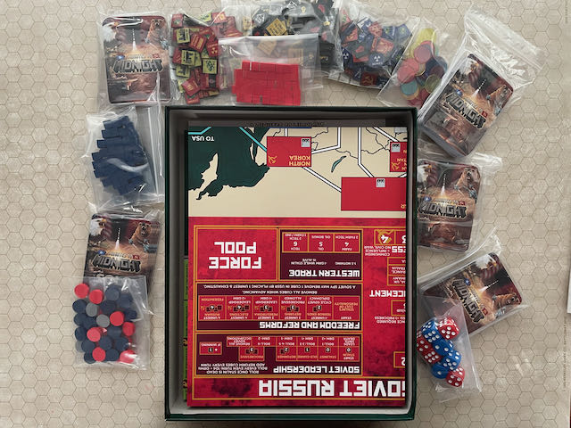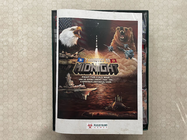 Like the Cold War, 2 Minutes to Midnight is a bi-polar, uh, two-player game though a solo play mode is also provided. According to the box, a full game of nine turns covering 1946 to 1991 could take up to six hours. Fortunately for us with time constraints, shorter scenarios rated for 2-4 hours are provided.