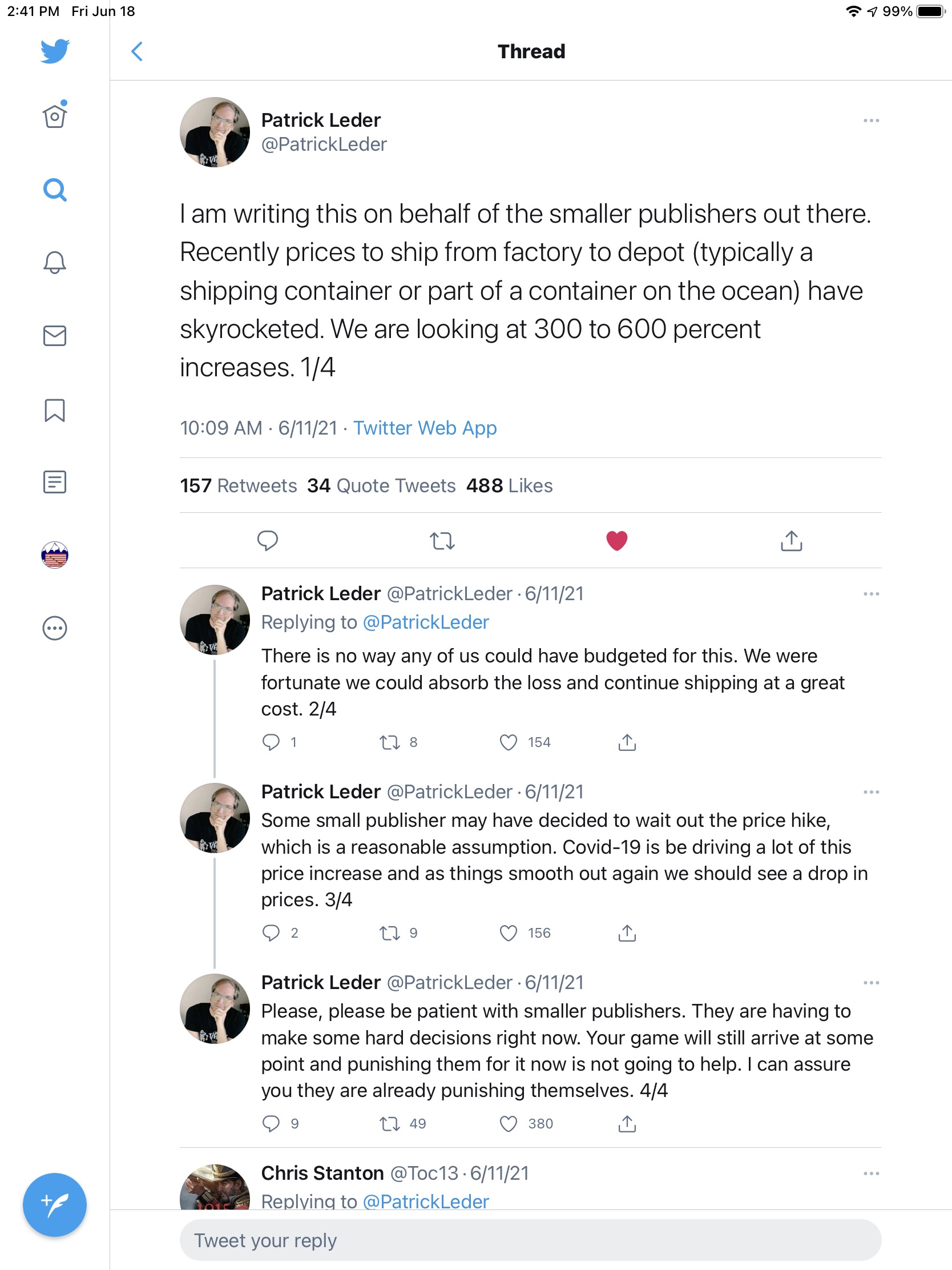 Sigh. Reality Shift from Academy Games is now mid-August delivery, several months removed from the planned May date. On the plus side, 1979: Revolution in Iran by Dan Bullock from The Dietz Foundation is moving along nicely but shipping problems may add some delay. Patrick Leder of Leder Games tweeted about that this week: