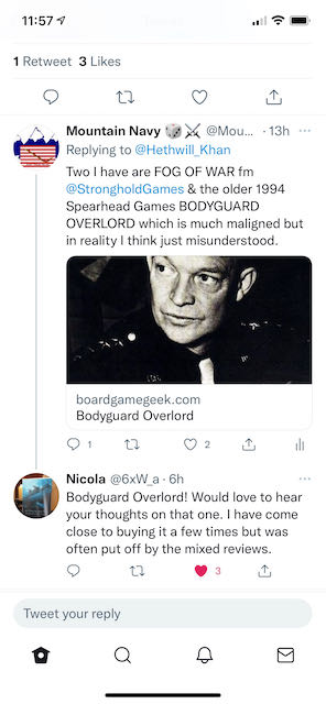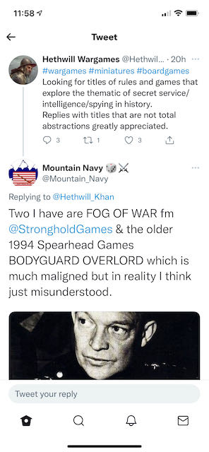 I wonder if Bodyguard-Overlord was printed today if the reception to the game would be different than it was 30 years ago. I feel that gamers, and especially wargamers, are more receptive today to “non-traditional” wargames than they were 30 years ago. Here I include myself; in 2017 when I rated Bodyguard-Overlord on BGG my rating of 6 came with the comment, “Focus on espionage, intelligence and deception is both its strength and weakness. Much better as an add-on like module to other games.” In 2017 I had very recently re-engaged with the wargame hobby and was bringing myself up to date from my limited (immature?) 1979-1999 baseline of knowledge. In light my current understanding of this game, I think I was misguided as I saw Bodyguard-Overlord back then as an expansion module, not an entire game. As a module it may be a 6—but as a game? I should rerate the game at least a 7, placing it just above, not below, my 6.56 game rating average.