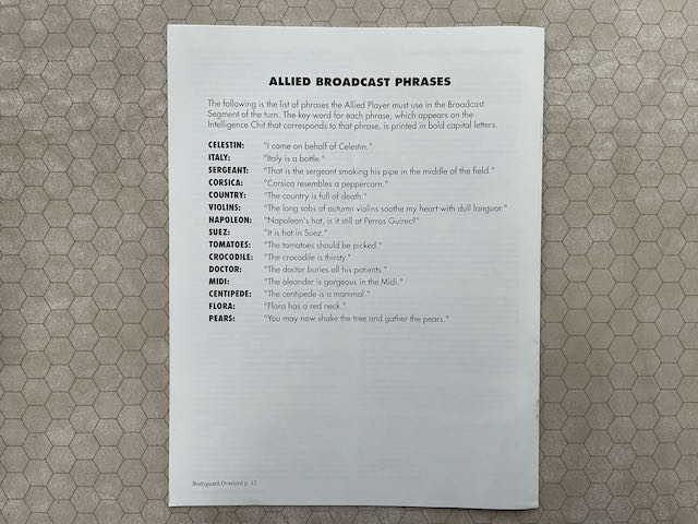 The Broadcast Segment of a Bodyguard-Overlord game turn simulates diplomatic, propaganda, and communications. Every turn the Allies must broadcast one of 15 phrases with one being the Partisan Trigger Signal and the second the Invasion Warning Signal. If the German player draws one of the phrases and it is broadcast, the German player may initiate unlimited attacks against Partisan units immediately.