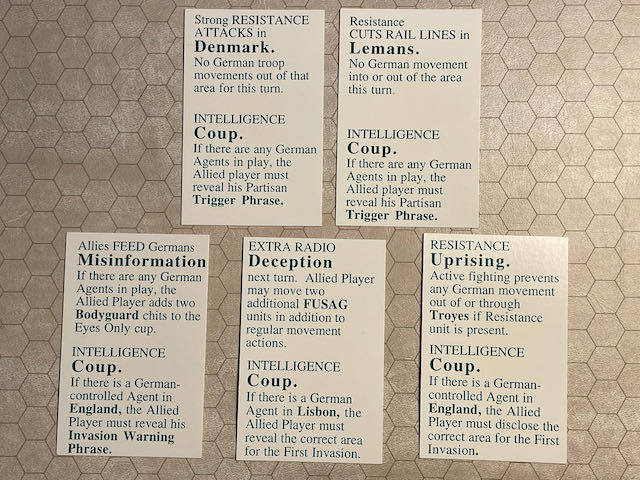 As you can see, an Intelligence Coup in Bodyguard-Overlord often reveals an absolutely vital element of Allied plans. While some might see this as overpowered and creating too swingy a game, I feel they are narratively quite appropriate. If the German player gets that lucky break, Bodyguard has broken down and the Allied player must now try to make the best of things. This doesn’t necessarily mean the invasion will not happen (an auto win for the German player) but it may not meet its objectives as quickly as the victory conditions (politicians? public?) demand. I don’t see this as a mark of a poor design; rather, I see it as a recognition of the hard realities of Bodyguard.