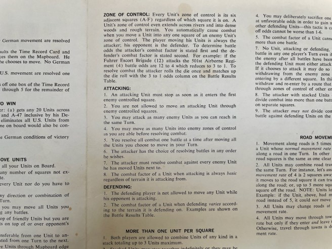Every turn in The Battle of the Bulge consists of four steps, laid out in a section labeled How to Play. Nowadays, the phrase “Sequence of Play,” or SOP, is far more common. This is another early example of how wargames drew from boardgames and at this point were yet to establish their own terminology. The same can be said of Victory Conditions which in these rules fall under the header How to Win.