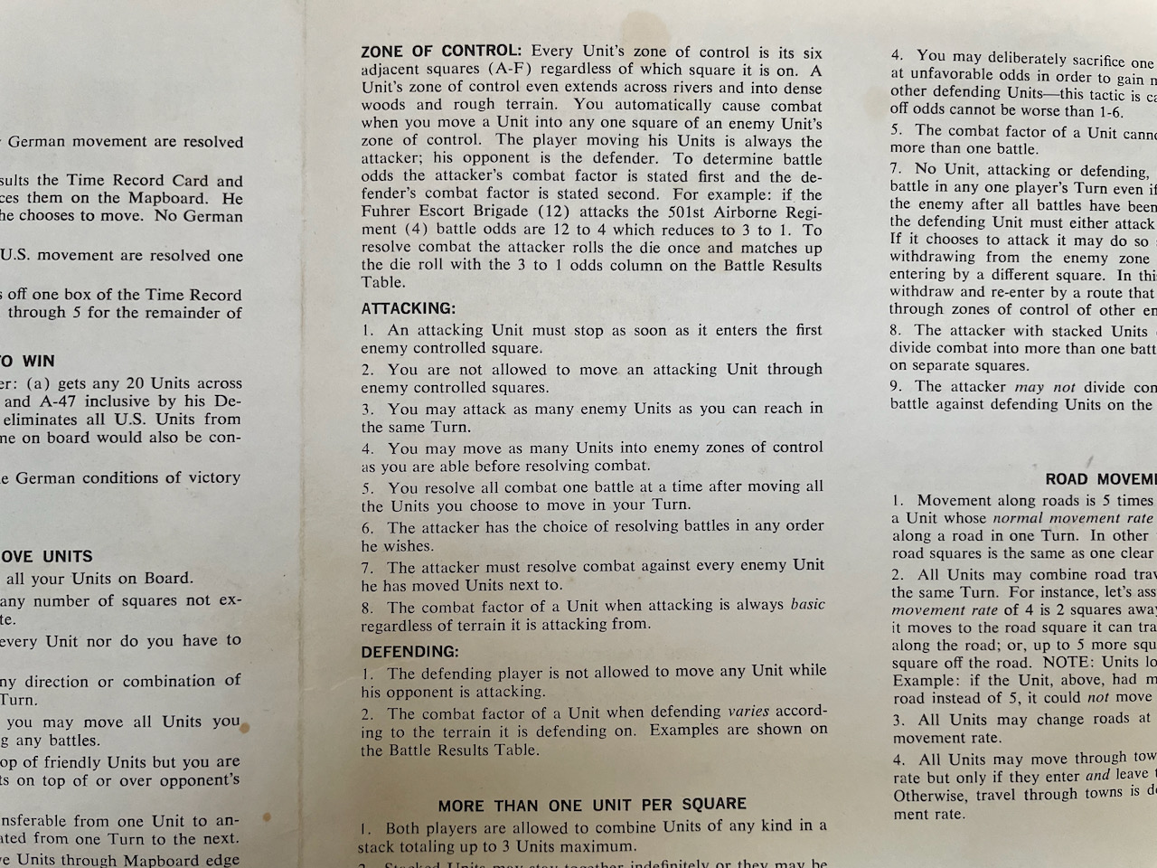 The Instruction Folder claims The Battle of the Bulge is a “historically correct re-creation of the famous World War II campaign of the same name. To back up this claim, General Anthony C. McAuliffe, USA, (Ret.) is credited with providing technical aid. Yet, even when acknowledging General McAuliffe there is still an emphasis on connecting the player to the game; “But now YOU are in command. YOU get the thrill of leading all of the same Regiments, Brigades and Panzer Units over a realistic topographical map of the actual battle area.”