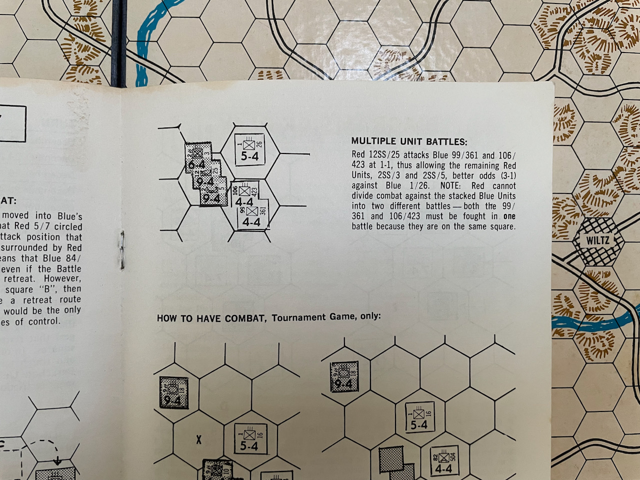 The Battle Manual for The Battle of the Bulge devotes three pages to Diagrams of Play. The first page is How to Have Combat and uses three graphics to show two examples. The second page has a single graphic attempting to explain Multiple Units Battles which is a shame since that may be the single most difficult rules concept to grasp. This is followed by two graphics (with two more on page three) devoted to How to Have Combat in the Tournament Game.
