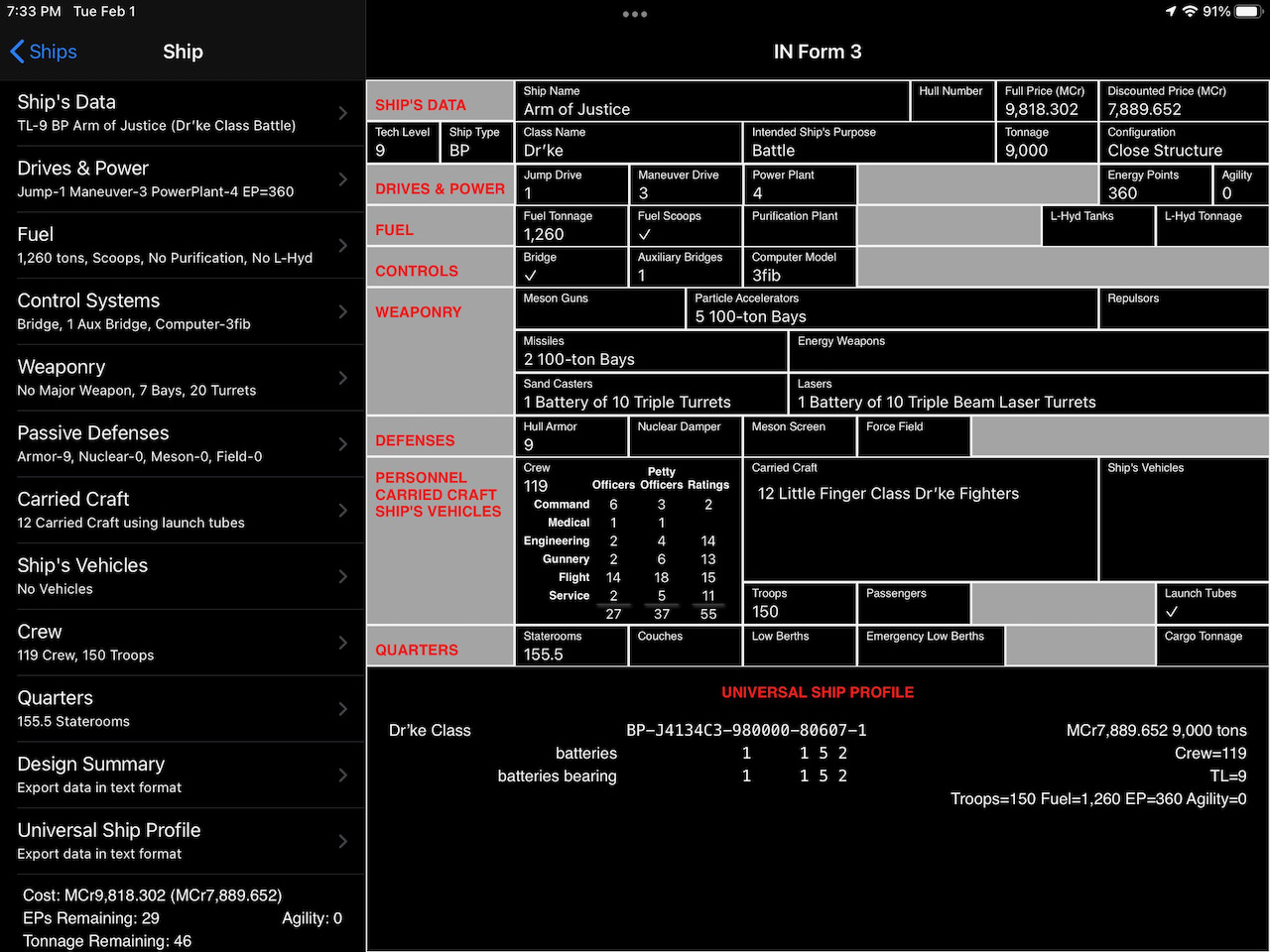 While High Guard gave me rules for creating naval characters, let’s not kid ourselves; the primary draw of the book always has been the ship design rules for very large ships. High Guard talks about ships up to one million tons (p. 20). The design sequence itself is very simple. Even today, I am impressed at just how simple the sequence is to follow. Best of all, one could do it on a worksheet (provided in the book) or a 5″x8″ notecard (I found a 3″x5″ a bit too crowded). While a calculator is certainly handy, a piece of scrap paper for solving a few equations was really all that is needed.