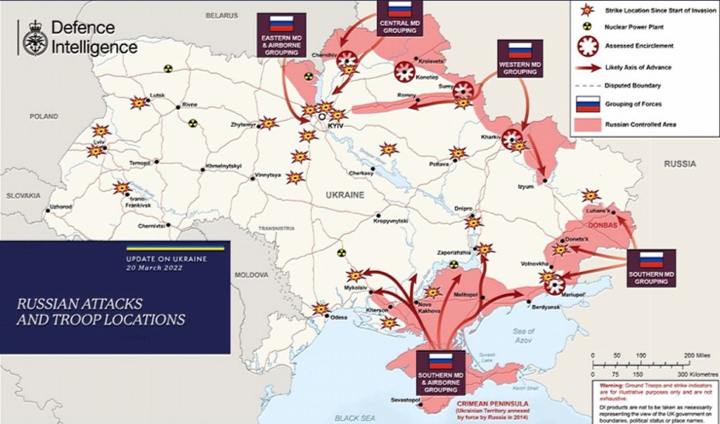 The UK MoD map is a broad overview of the fighting with likely lines of advance shown. It also uses what I call “creeping red areas” to show the area the Russian Army supposedly controls. The detail provided on Russian forces is extremely broad.