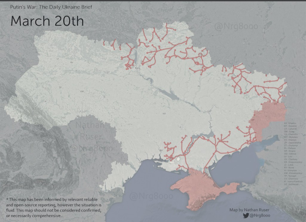 Still others try to capture the seemingly different war going on in the Ukraine. @Nrg8000 produces two maps, one of which focuses on routes the Russian Army has advanced on using a very point-to-point map approach.
