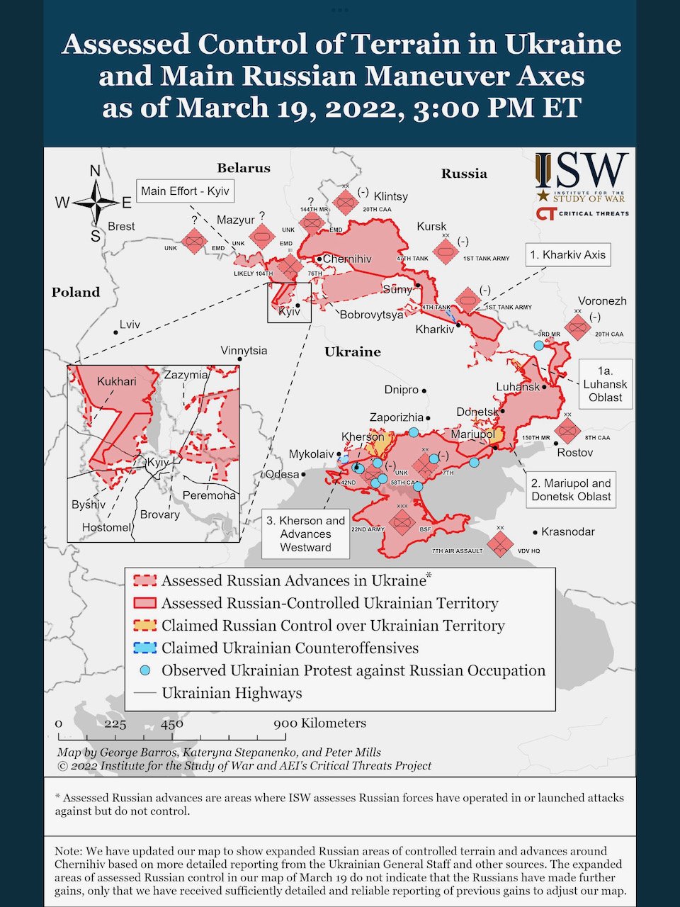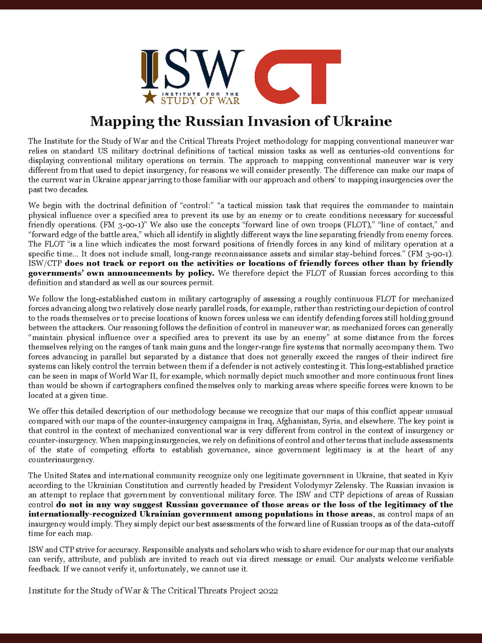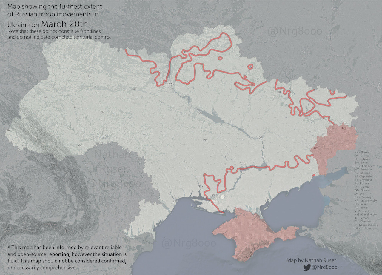 The second map from @Nrg8000 is a carefully labeled map showing the “furthest extent of Russian troop movements.” This wording seems to out of the way to not ascribe control of an area to the Russian forces.