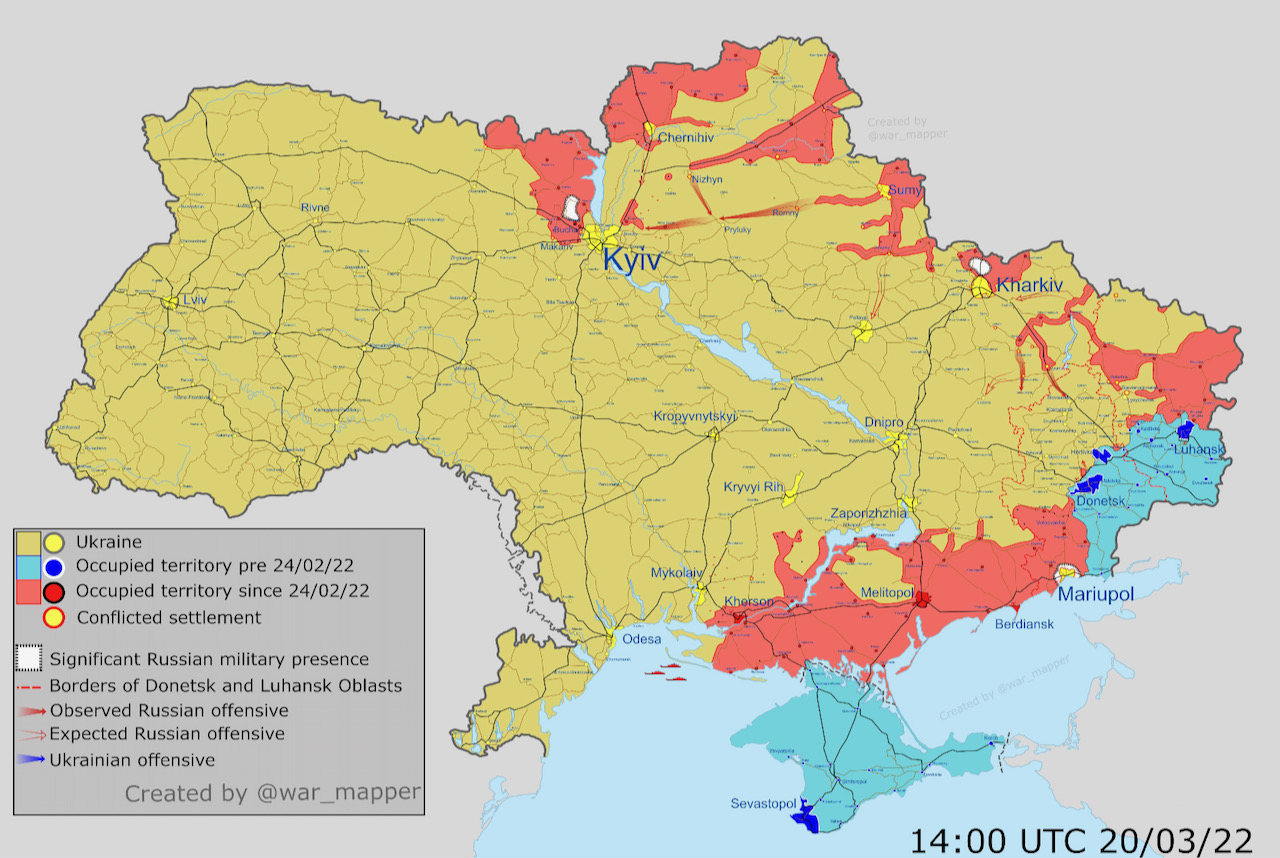 The open source intelligence (OSINT) community on social media is also tracking the war. @war_mapper delivers maps that show the pre-war occupied areas and the areas occupied since the start of the war. Interestingly, the illustrator doesn’t only use filled in areas, but shows a combination of “lines of advance” and “occupied areas” in a kind of combination area and point-to-point map.