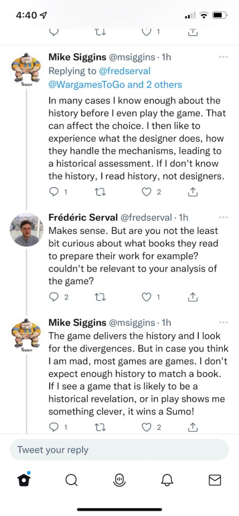 I (mostly) agree with Mike Siggins when it comes to publishers, and designers. I usually follow publishers only enough to see what their schedule is. I sometimes track designers just to see what they are working on…if I am interested. As far as “content creators” go I tend to look at boardgame reviews more than wargames. More often than not, I end up looking at a review of a game AFTER I play it.