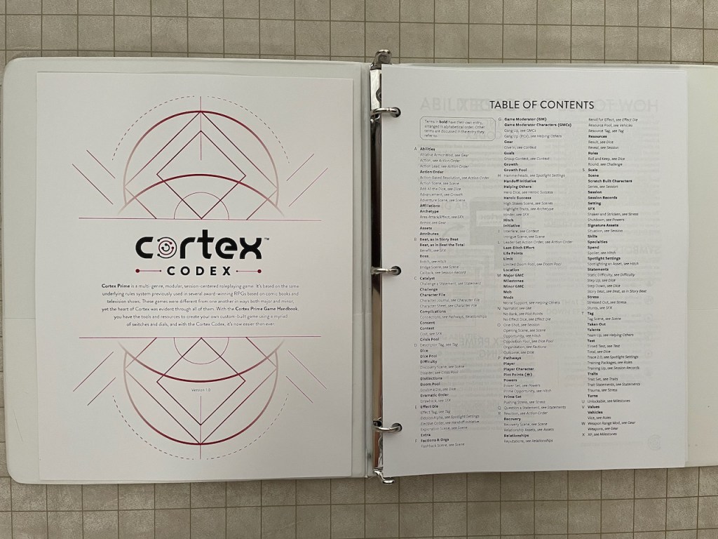 The Cortex Codex is a three-hole punched, loose-leaf assembly of the rules. I think I can see what the publisher/designer intended; each major rule is its own section that can be swapped out and updated as necessary. New rules are simply added in (alphabetically) as needed.