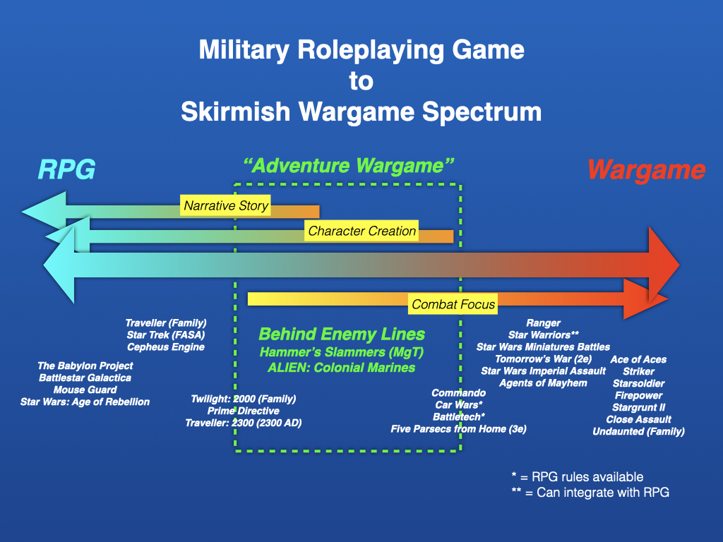 I’m not the greatest graphics artist, so please bear with me as I try to explain what you see here. I envision a spectrum of gaming that goes from military roleplaying games on the left to skirmish-scale wargames on the right. The more to the left you go the more the games are composed of narrative storytelling and character creation. The further you move to the right of the spectrum the more the focus of the game is purely on combat. In the middle are games that I am willing to call an “Adventure Wargame.”