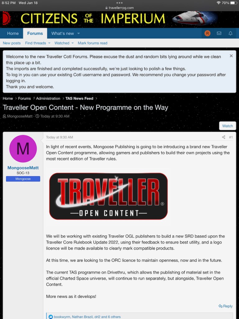 “…in case of termination of the WOTC OGL all sublicenses survive….” Sorry, it doesn’t work that way. The Traveller SRD is licensed using the language of the WoTC OLG 1.0a. If 1.0a is “deauthorized” then no new content can be created—by anybody—using an SRD opened via OGL1.0a. I’m pretty sure WotC didn’t consider that others use OGL 1.0a for products beyond D&D (and if they did I’m equally sure they don’t care). All would be fine if Mongoose, copyright owners of the Traveller SRD, simply “relicensed” it but I don’t see that happening.