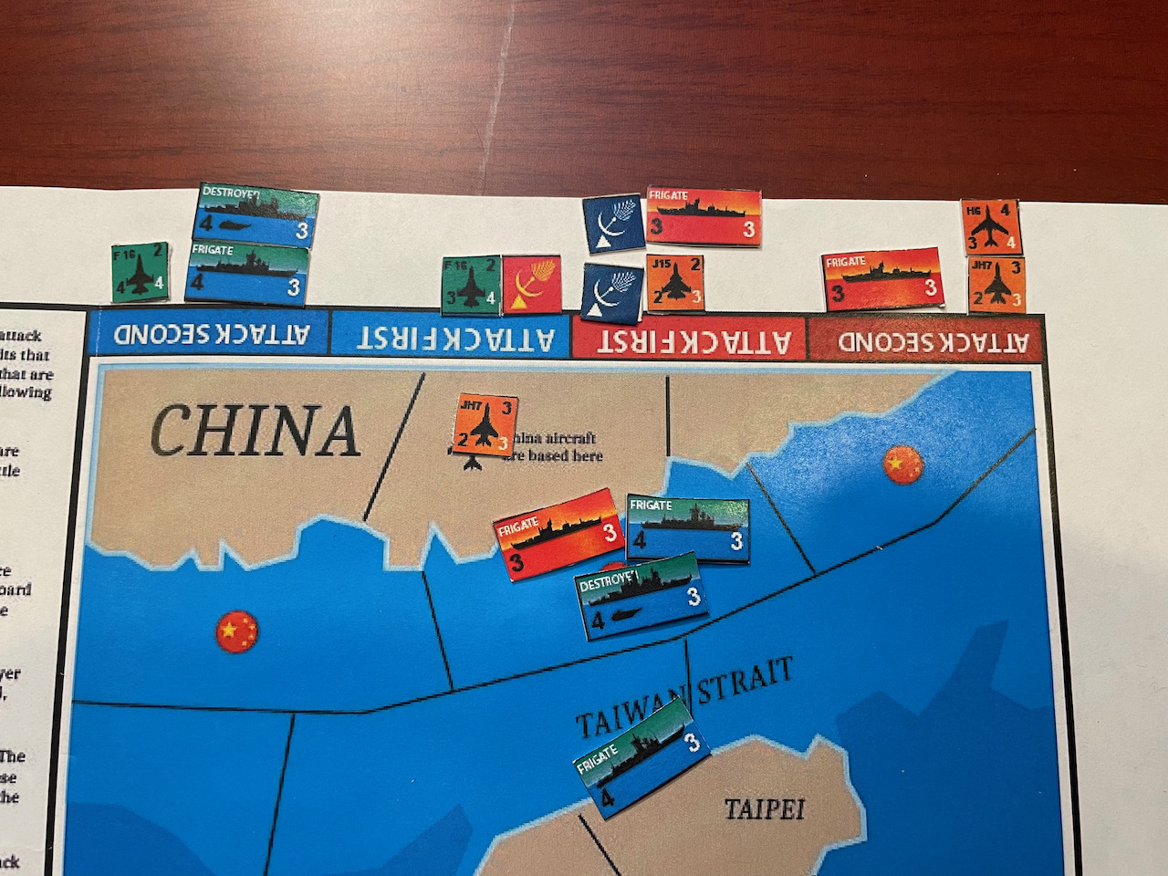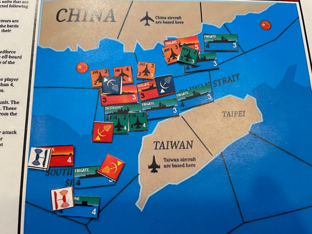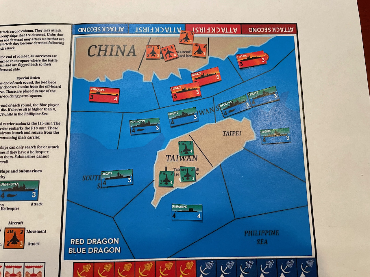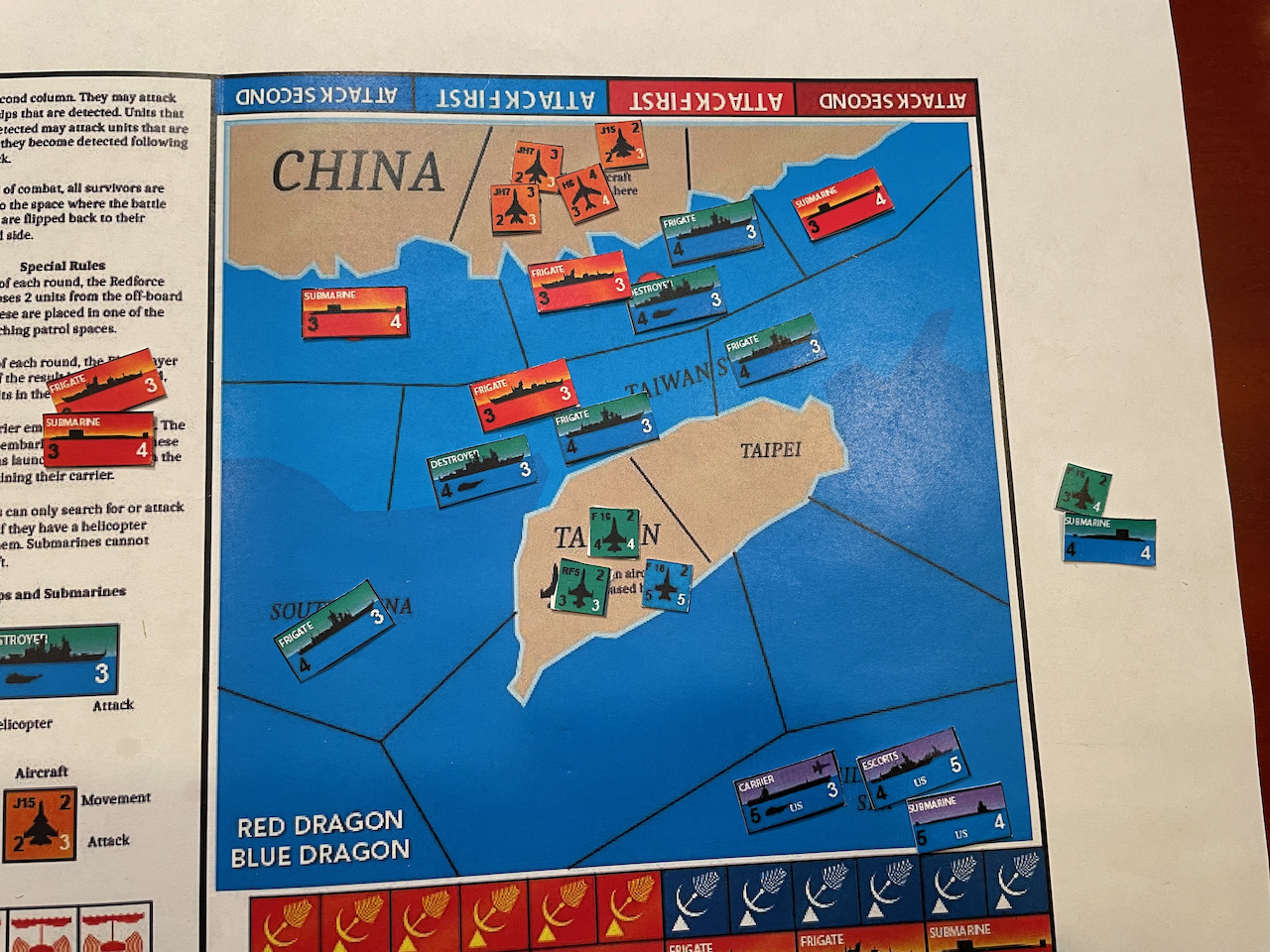 In order to win Sparring Dragons the PRC player must keep their amphibious unit next to Taiwan for one complete turn. Alas, in this game the early entry of the U.S. Navy enabled them to hold off the PRC invasion and ultimately claim victory.