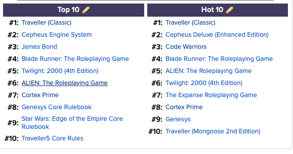 That Traveller (Classic) in my Hot 10 list is actually Classic Traveller (Facsimile Edition) which I can’t find in the database. I took a stab at adding it to the database but contributing an RPG item requires extensive knowledge of so many other parts of the database (like existing genres or systems or more) that I frankly just gave up.