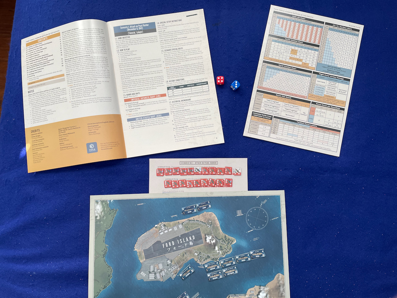 The first time I read the scenario title, “Scenario 1. Attack on Pearl Harbor (December 8, 1941)” I winced at the typo. Everybody “knows” that Pearl Harbor was attacked on December 7, right? Well, not if you were in Japan on the other side of the International Date Line! The original Japanese edition of Task Force was designed by Ginichiro Suzuki and the rules and graphics in this Vuca Simulations edition are inspired by that original.