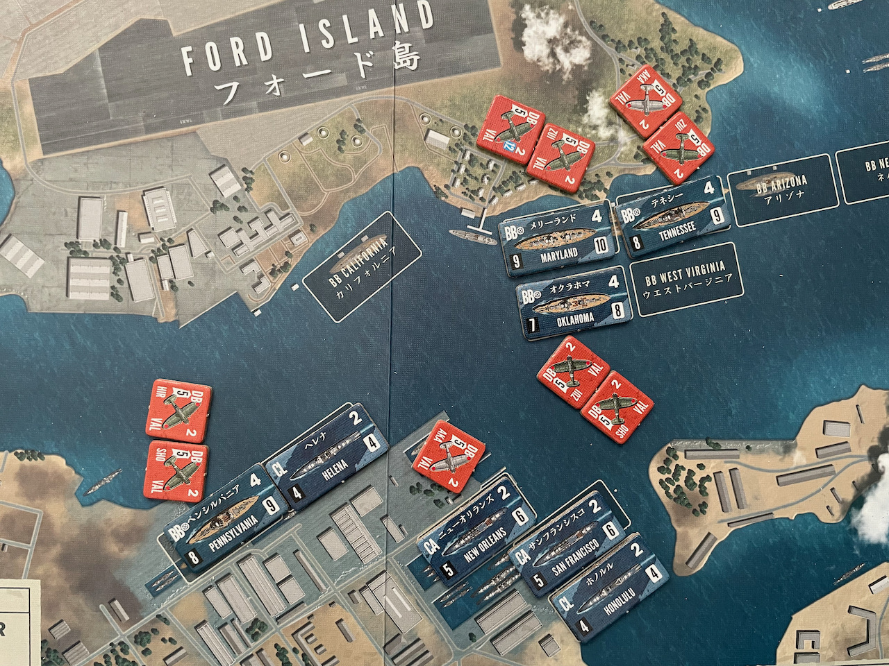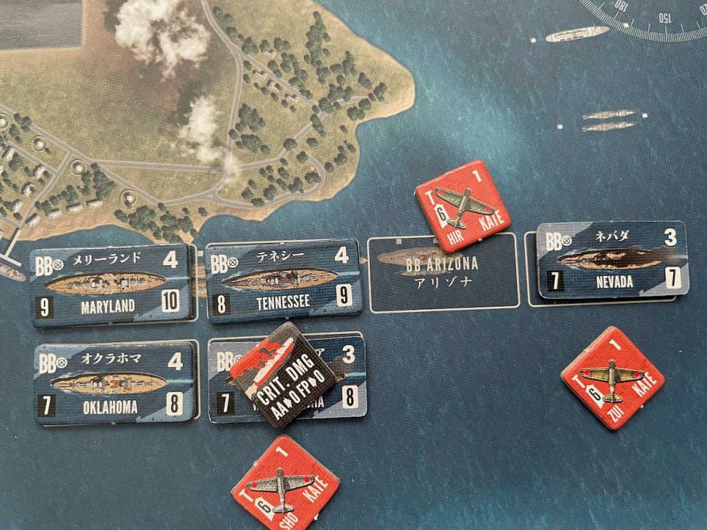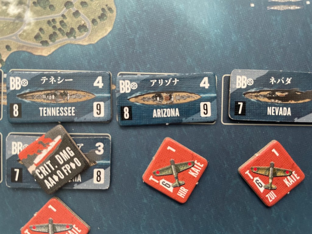 The second wave has to face anti-air fire. The results are three “half” units of attackers lost or about 12 planes total. They manage to score Significant Damage on Pennsylvania, Maryland, Tennessee and New Orleans. Oklahoma suffers Critical Damage.