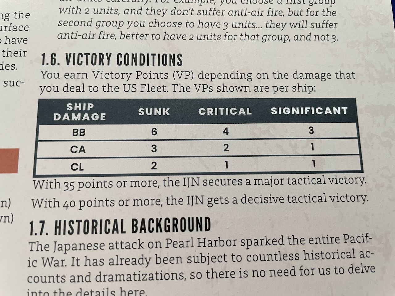 The Critical Damage on Oklahoma yields four more points while the Significant Damage on three more battleships is another nine points. The Significant Damage on New Orleans is one point more. That’s a total of 38 points or a Major Tactical Victory.