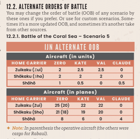 In Task Force the American carriers can carry more aircraft than the Japanese. The mix of aircraft is generic in most scenarios, but there is an Alternate OOB [order of battle] presented in the scenario book with historically accurate aircraft mix. Not that it makes that much of a difference. In another nod to abstraction dive bombers and torpedo bombers are only distinguished by their combat value; the specific type of aircraft has no impact on play (with one notable exception being the early USN TB which has a strike range of 4 hexes rather than 5 in scenarios before Midway).