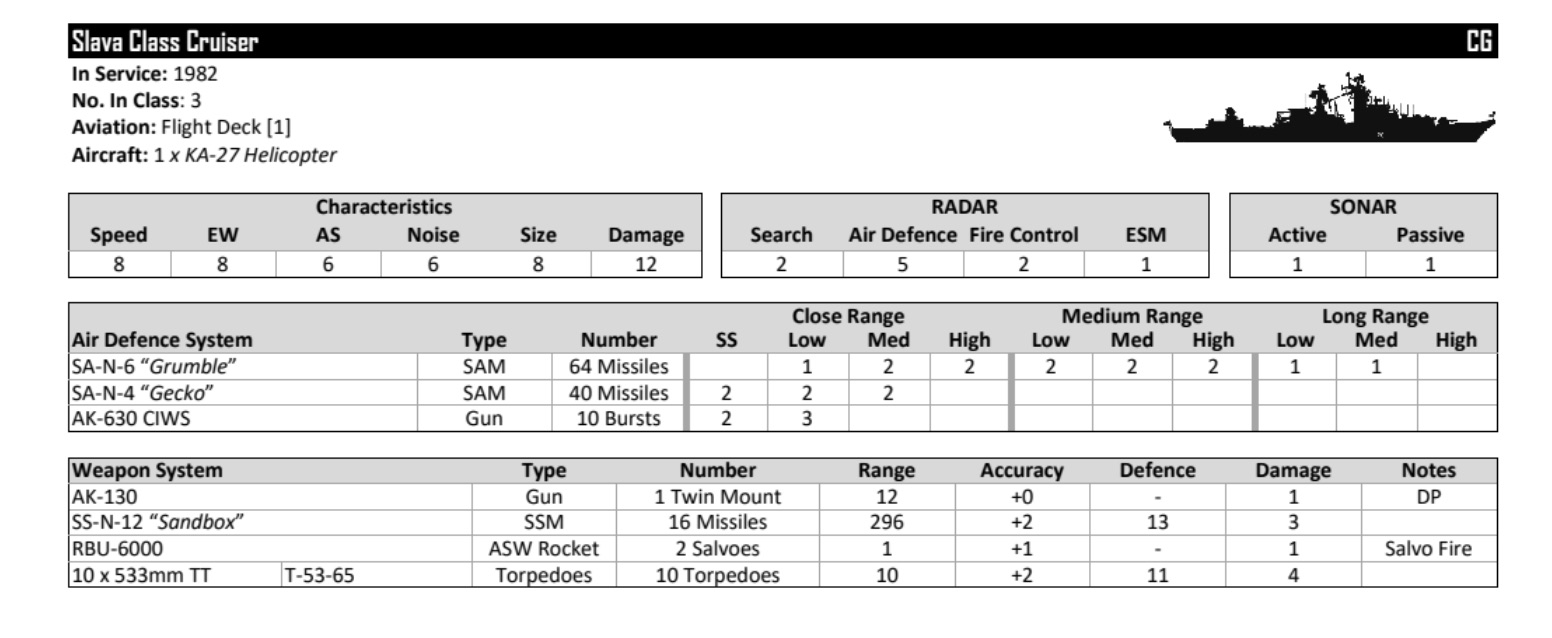 Let’s assume Moskva…a Russian Slava Class Cruiser as shown above, is hit by 2x SS-N-25 “Switchblade” SSM. The Naval Command data annex says a Switchblade has Damage 3. Two missiles “score” six hits, and with average rolls on the Damage table under rule 27.2 Resolving Damage yields 3x Fire, 2x Flood, and 1x Structure. The Structure hit automatically and immediately reduces speed by 1 cm and the Flight Deck launch rate is reduced by 1 (now 0 or no flight ops). In the Damage Control Phase, Moskva rolls 1d10 to determine how many damage control parties markers it gets; a ship with 12 Structure/Damage can remove between 0-3 (average 1) damage. Let’s assume that one Fire is removed. Next we need to determine “progressive” damage from the Flood and Fire markers: