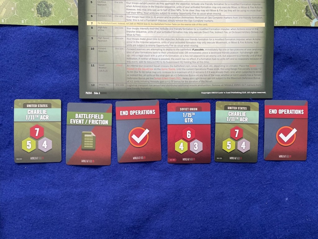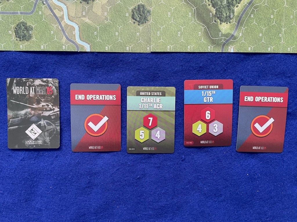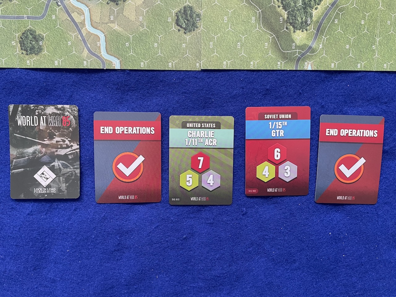 Scenario 1 of World at War 85: Storming the Gap is a simple learning scenario with two formations; the U.S. player has “Charlie 1/11th ACR” which is defending against an attack by the “1/15th GTR.” Per the scenario setup rules, the Soviet player has a single Formation Card and the U.S. player has two. The use of the Battlefield Event/Friction Card is optional in this scenario (added here) and two End Operations Cards are shuffled into the Formation Deck. Once assembled, the Formation Deck has a total of six cards.