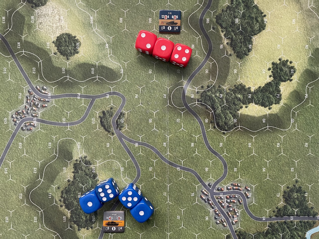 Direct Fire in World at War 85 uses a dice pool game mechanism. Take for example a Direct Fire action with a West German Leopard 2 tank shooting at an East German T-72 tank.