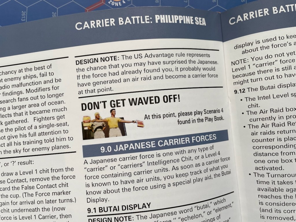 The programmed learning points for Carrier Battle are found where “Don’t Get Waved Off” text is inserted in the rules. Those recommended “wave off” points are tied to specific scenarios: