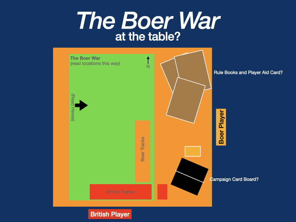 - For the Boer player, the Side Board is closer than the Main Board (reversed like the British player) meaning it will take a longer reach to get to the Main Board; again, the Campaign card board (Tableau) is to the Non-Dominant Hand side (assuming right-handed) and all hex numbers are upside down and location names sideways.