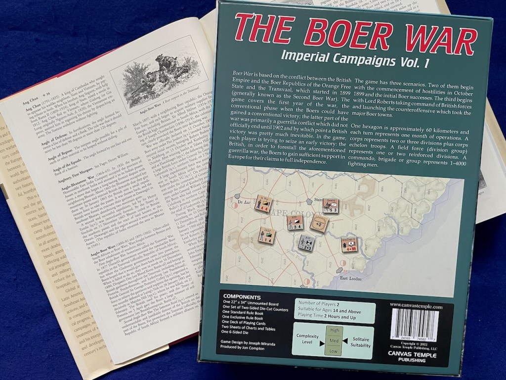 I appreciate the motto of Jon Compton at Canvas Temple Publishing: “Old Codgers Trying to Retire!” It’s something I can really relate to. I also relate to the game packaging philosophy behind Canvas Temple Publishing (CTP). CTP makes games for, how shall we say, more aged Grognards who don’t have the sharpest of eyesight or the most nimble of fingers. This means CTP games “go big” in terms of hex size and counters. The latest offering from CTP, The Boer War: Imperial Campaigns Vol. 1 (Joseph Miranda, Canvas Temple Publishing, 2023) shows the good—and challenges—of the CTP approach.