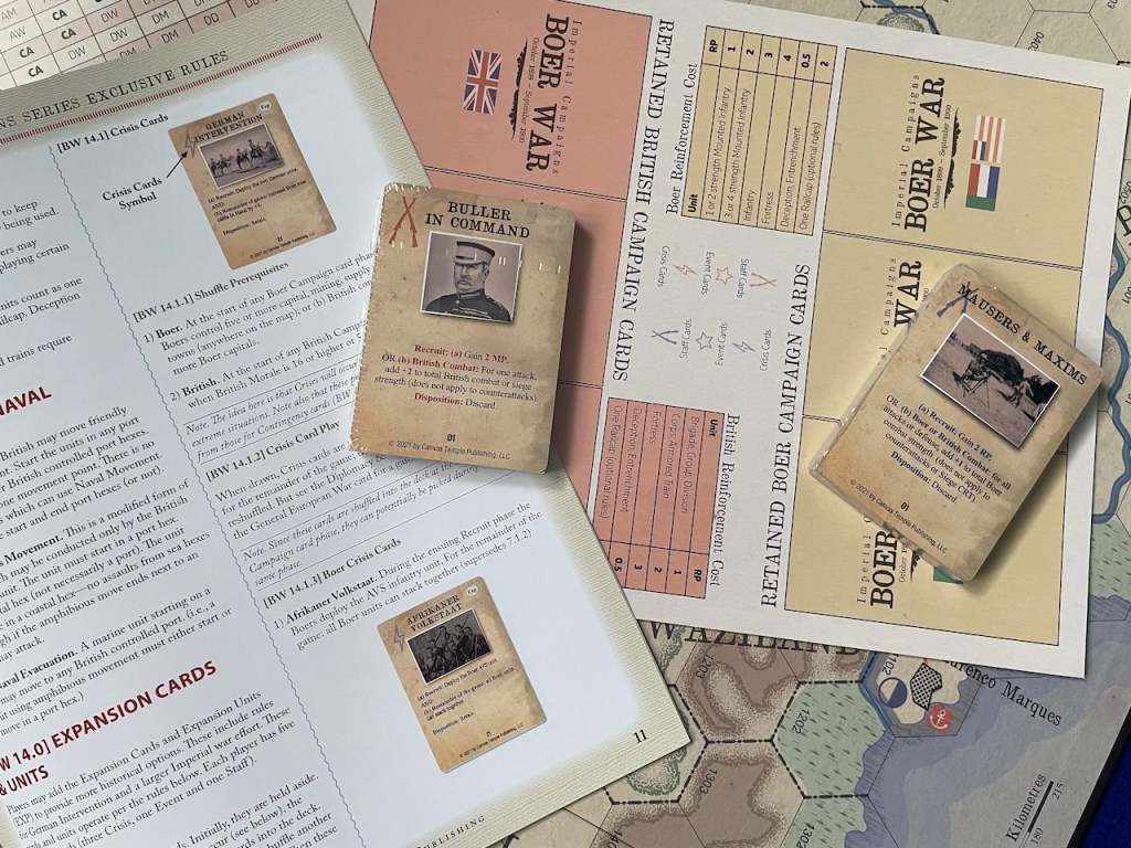 The Canvas Temple Publishing version of The Boer War appears to be a reprint of a previous Joseph Miranda wargame, Boer War: The Struggle for South Africa: 1899-1902 published by Decision Games in Strategy & Tactics magazine issue #205 in Sept/Oct 2000. I do not own the original game so my comparisons are limited to what little is visible on BoardGameGeek. As far I can tell, The Boer War is an update of the older game with new graphics for the rule books, map, and counters. The games are not identical; whereas the original Boer War used a Political Points track The Boer War uses Campaign cards. It is likely that The Boer War incorporates much—if not all—the scenarios, Design Notes, Experimental Rules, and errata that were printed in Strategy & Tactics #214.