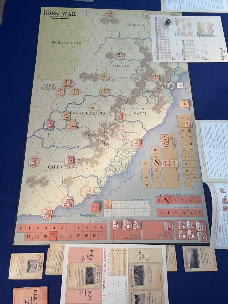 Late addendum – I reset the board for a second try using the above seating arrangement on a 3’x5′ table and it actually wasn’t so bad. I placed the board in the middle spanning the 3″ width with the Boer player sitting on the short east side and the British player sitting on the south. The campaign board stayed in the ‘southeast’ and the rule books and player aids moved to the ‘east side’ of the map board. Most importantly, in this configuration the British player did not have to reach across the Boer player area. That simple change seemed to make a world of difference. The problem is, given usual seating arrangements, it won’t work at many game conventions (or maybe even dining room tables).