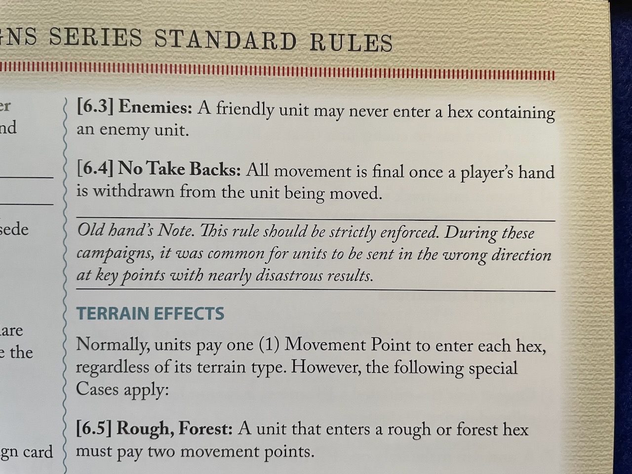 Whether we want to admit it or nor, each wargame is unique and no matter how much one thinks they know the rules it is always, always better to completely read the rule book. The rule books in The Boer War make excellent use of an “Old Hands Note”…or is it “Old hand’s Note?” [Oh, for a good proofreader!] For example, rule 6.4 No Take Backs states “All movement is final once a player’s hand is withdrawn from the unit being moved.” The “Old hand’s Note” that follows reads “This rule should be strictly enforced. During these campaigns, it was common for units to be sent in the wrong direction at key points with nearly disastrous results.” I chuckled at this “game justification” that specifically addresses one of the most endearing arguments of wargame etiquette.