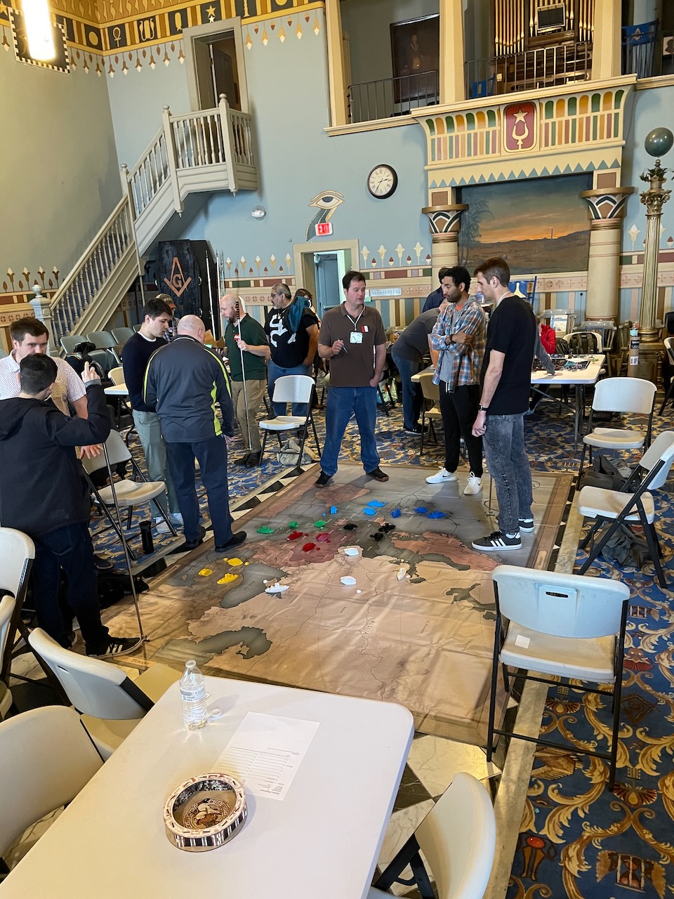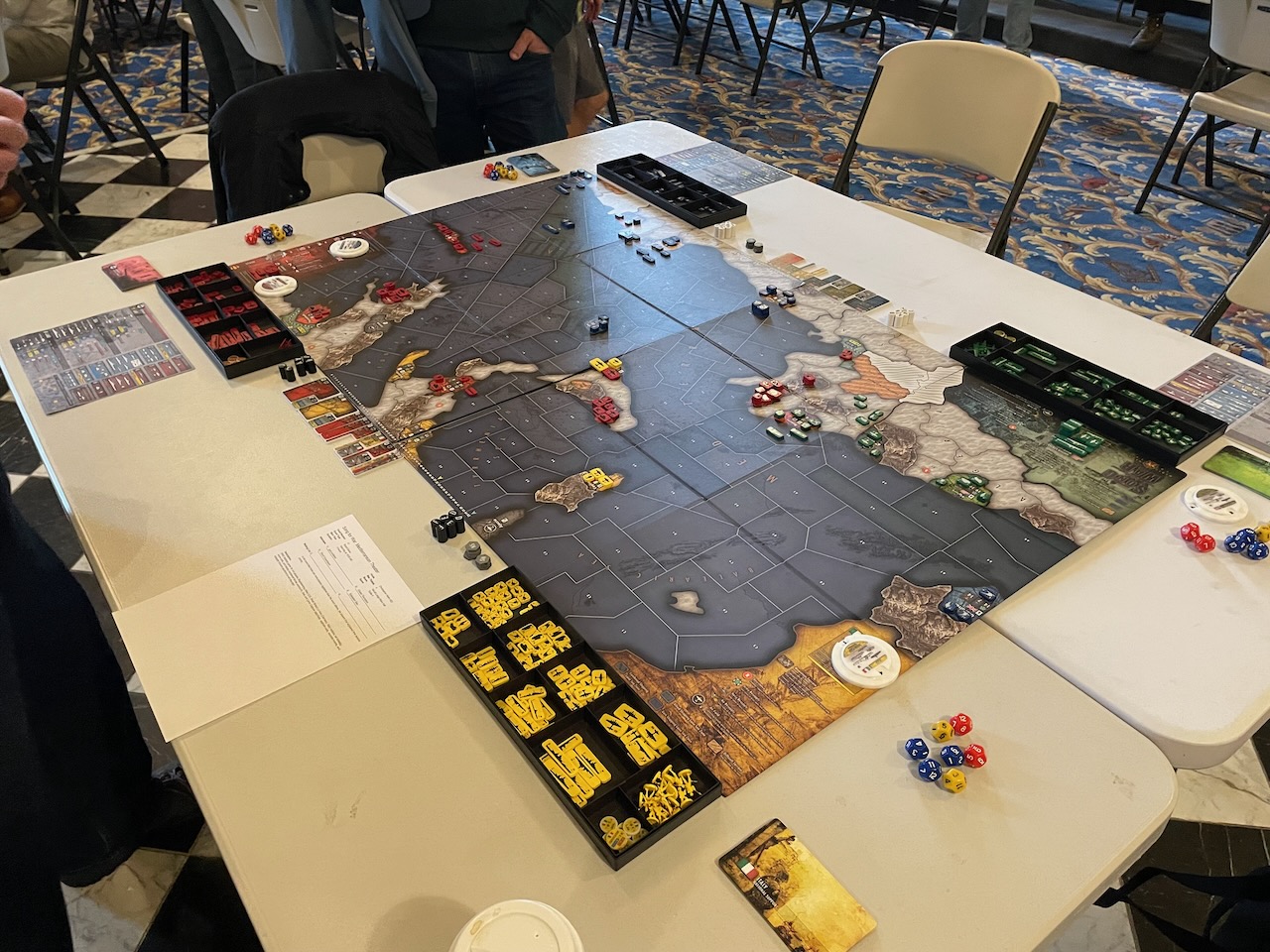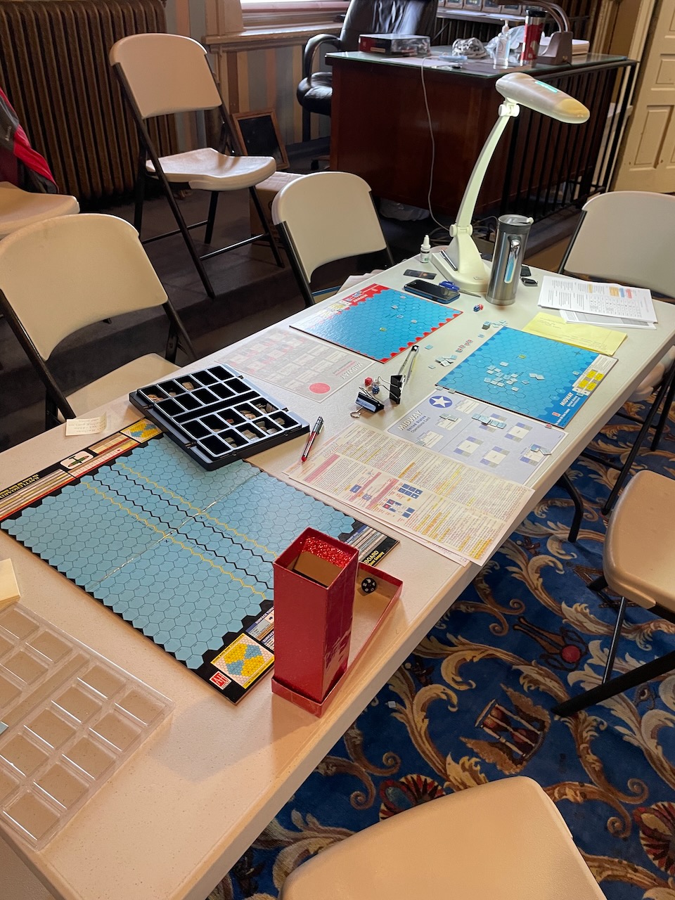 My deepest thanks to Kevin Bertram of Fort Circle Games for organizing and hosting this awesome little convention. I’ll let all of you in on a little secret—this is my first non-professional gaming convention I attended in person since Genghis Con 1982 in Denver, Colorado (several lifetimes ago). It’s not that I don’t want to attend gaming conventions, it’s they just often don’t line up with my personal or professional obligations. I really enjoyed the flavor of this small con which allowed me not only to play but to also meet and talk to different designers and players. I am already looking forward to next year. Who knows? Maybe I’ll try my hand at running an event of some sort, or maybe sponsor a prize in the raffle drawing (I’m sure Kevin is taking note to those comments right now!).