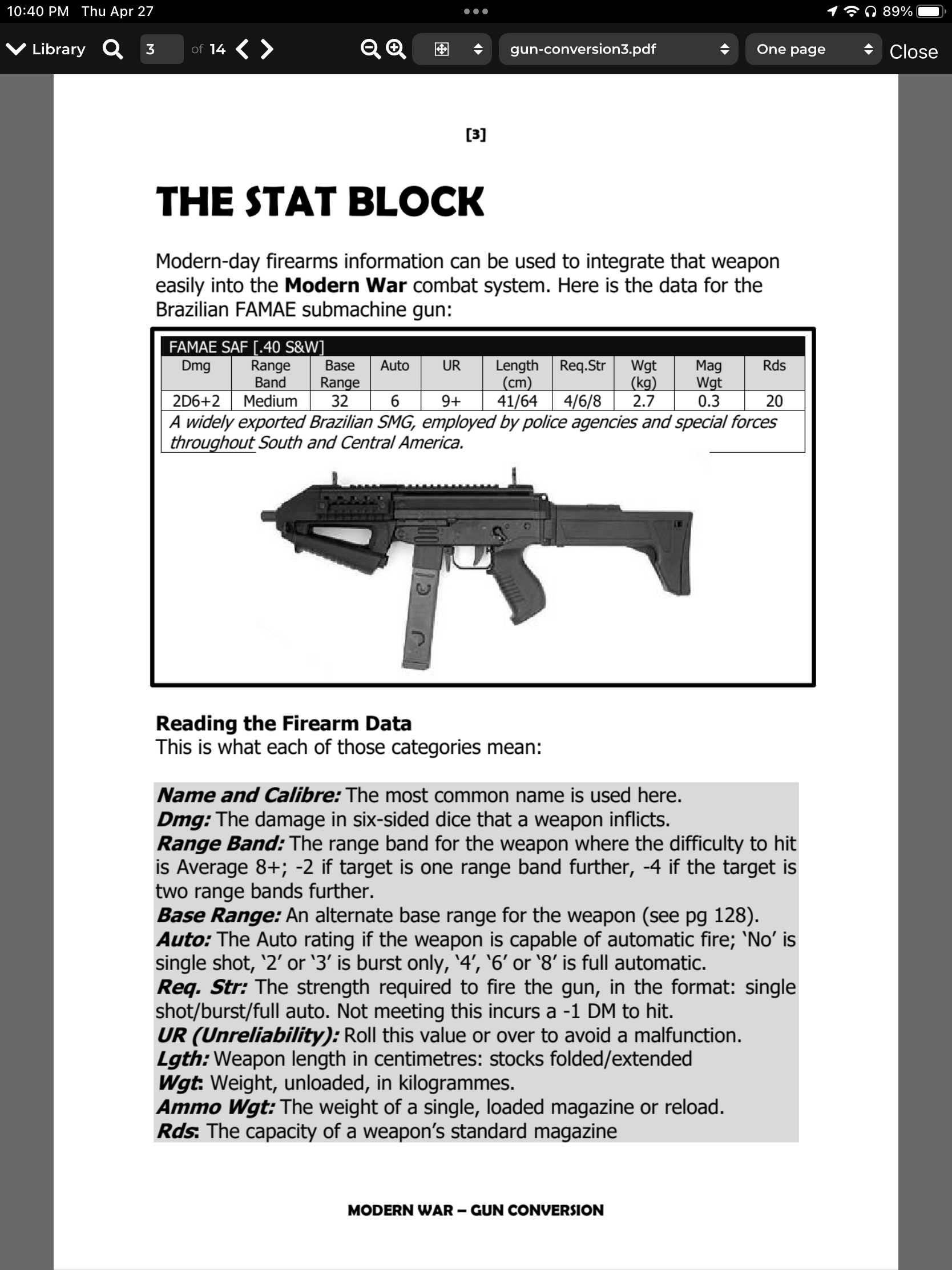 What Doomsday Soldier “lacks” are rules for creating your own vehicles or other worldbuilding minigames. Then again, there are a few modern Cepheus Engine products already out there (like Modern War from Zozer Games) that finding material should be easy. As a matter of fact, Modern War has a FREE conversion guide to take any modern firearm found on Wikipedia and “convert” it for use in a Cepheus Engine game.