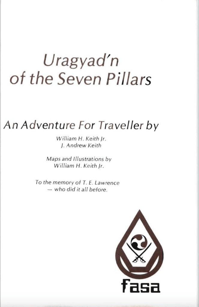 Uraqvad’n of the Seven Pillars was written to allow a handful of adventurers to enter a situation where they, alone, hold the destiny of an entire planet in their hands. It has been balanced in such a way that their presence, their military backgrounds, and their weapons will make possible nomad resistance to the Talaki invaders, and the end result – determined by their decisions and actions will [snip]. Even in the Traveller universe, individuals DO count for something.