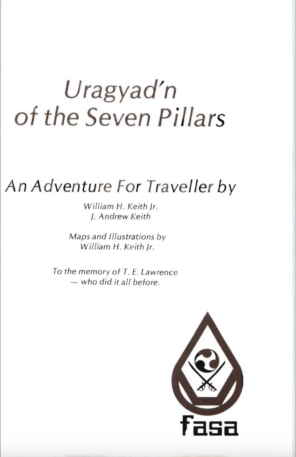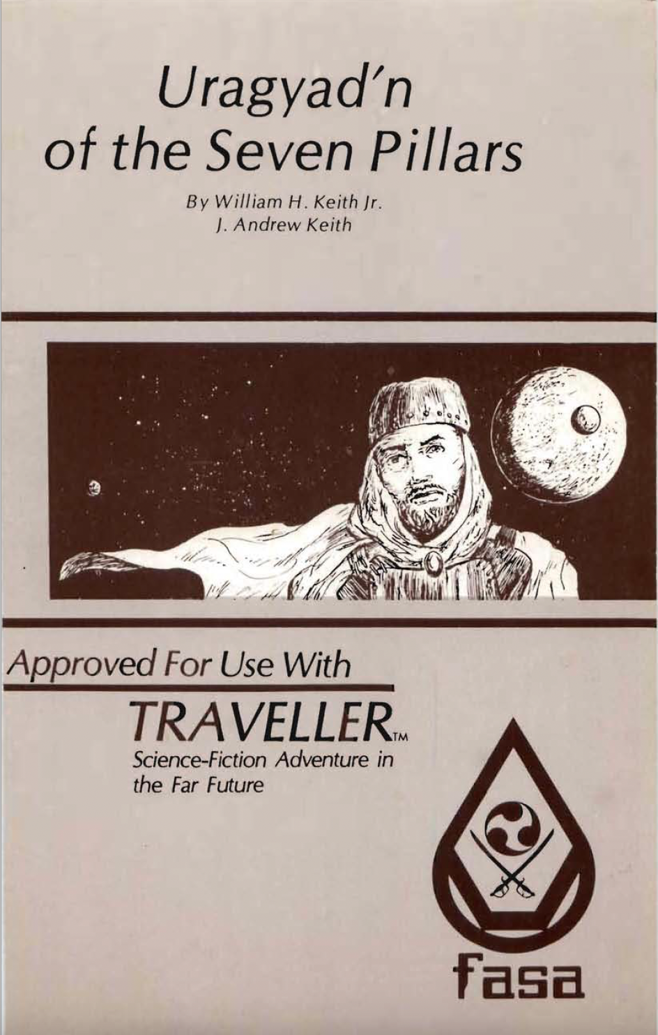 This booklet, entitled Uraqyad’n of the Seven Pillars, is a complete adventure designed for use with Traveller, the science-fiction role-playing game by Game Designer’s Workshop. Set in the Cabala Subsector of the Far Frontiers Sector, it chronicles a guerrilla war on a desert planet held in the grip of a ruthless military dictatorship.