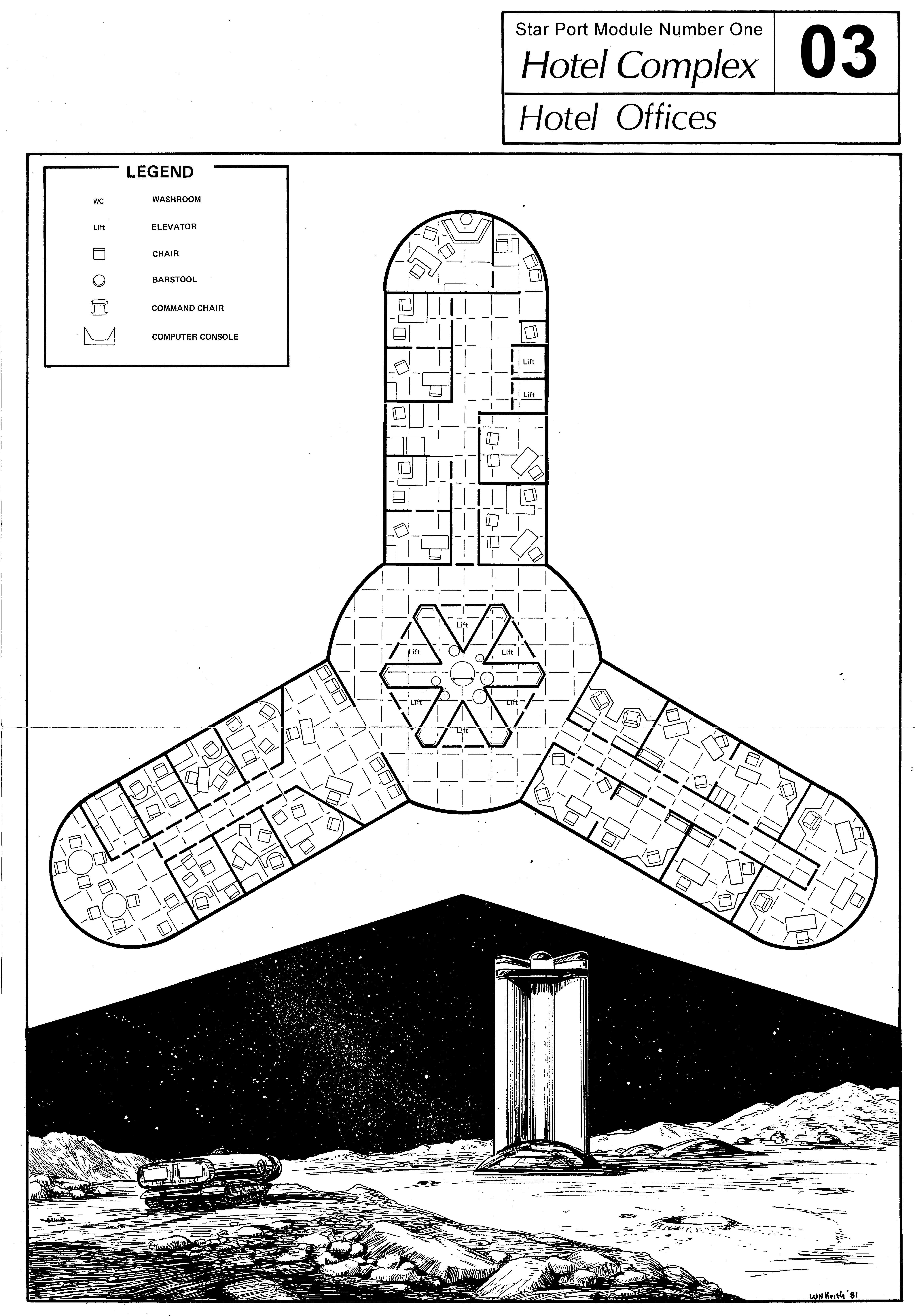 Of the Starter Collection, I still have my copy of the 15mm floor plans for the Starport Hotel Complex. I can’t even start to tell you how many times player characters walked, stalked, or fought their way through these now-hallowed halls.